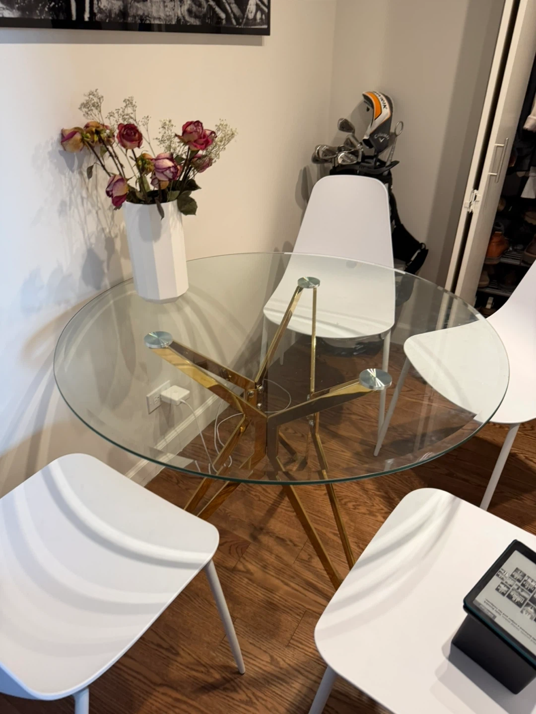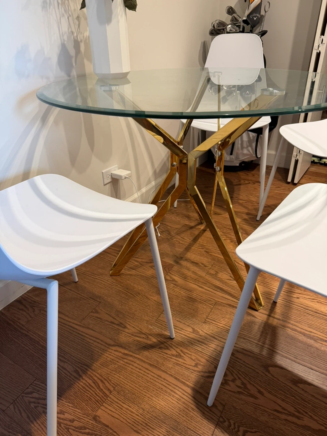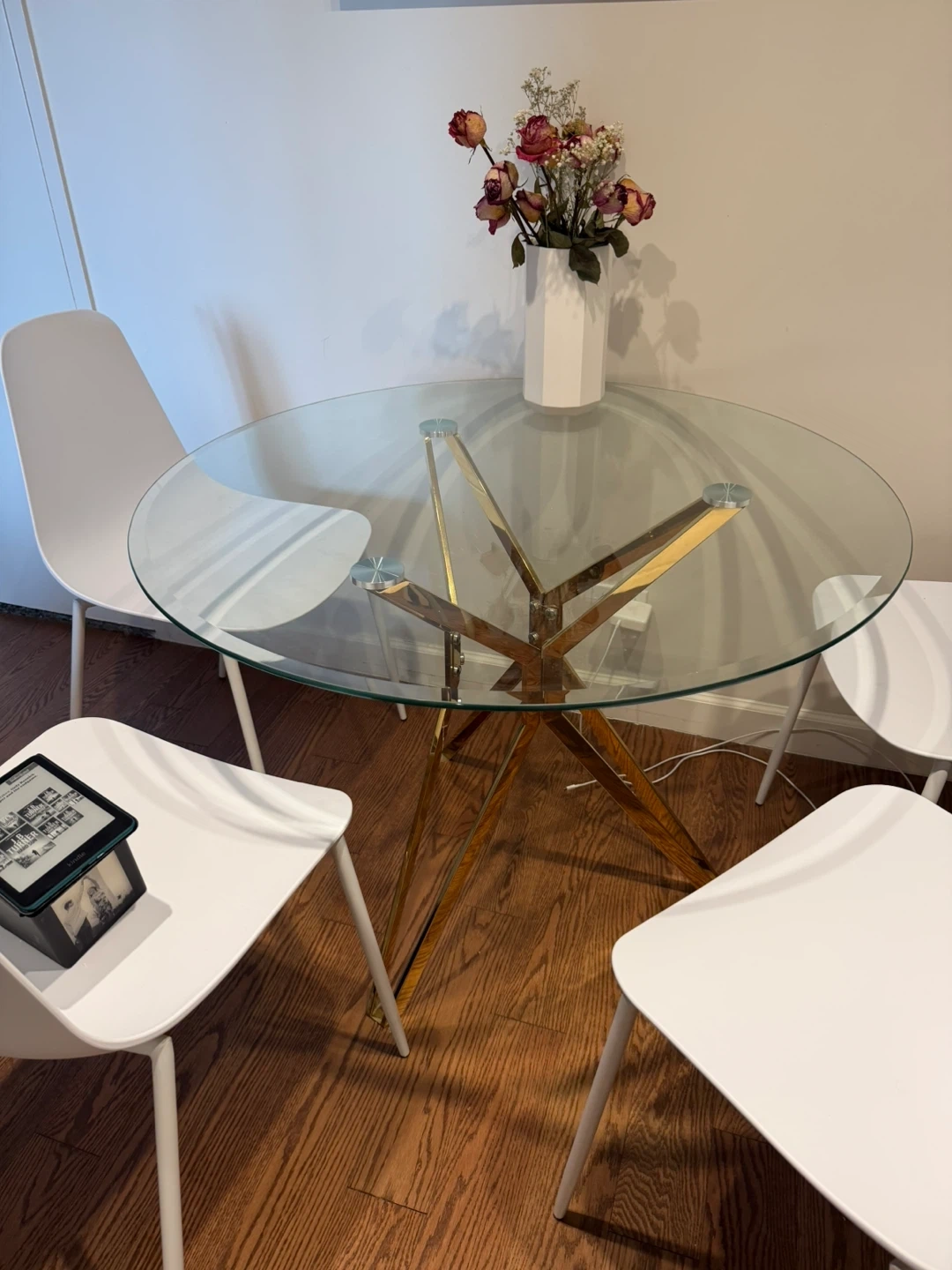 Round glass top dining table. Features a striking gold starburst base. It's a great size for smaller dining areas or breakfast nooks. Glass top is clear and sturdy.