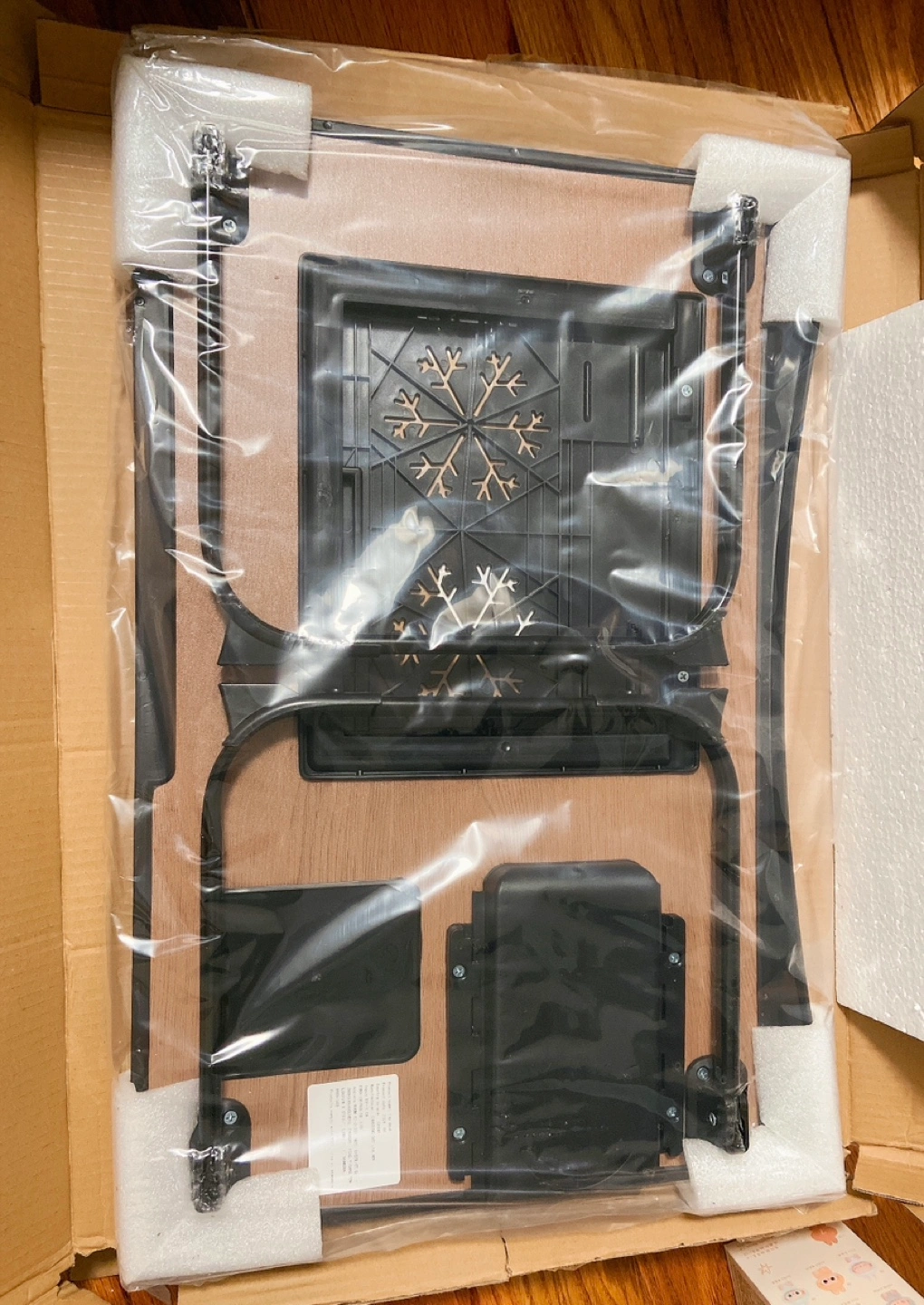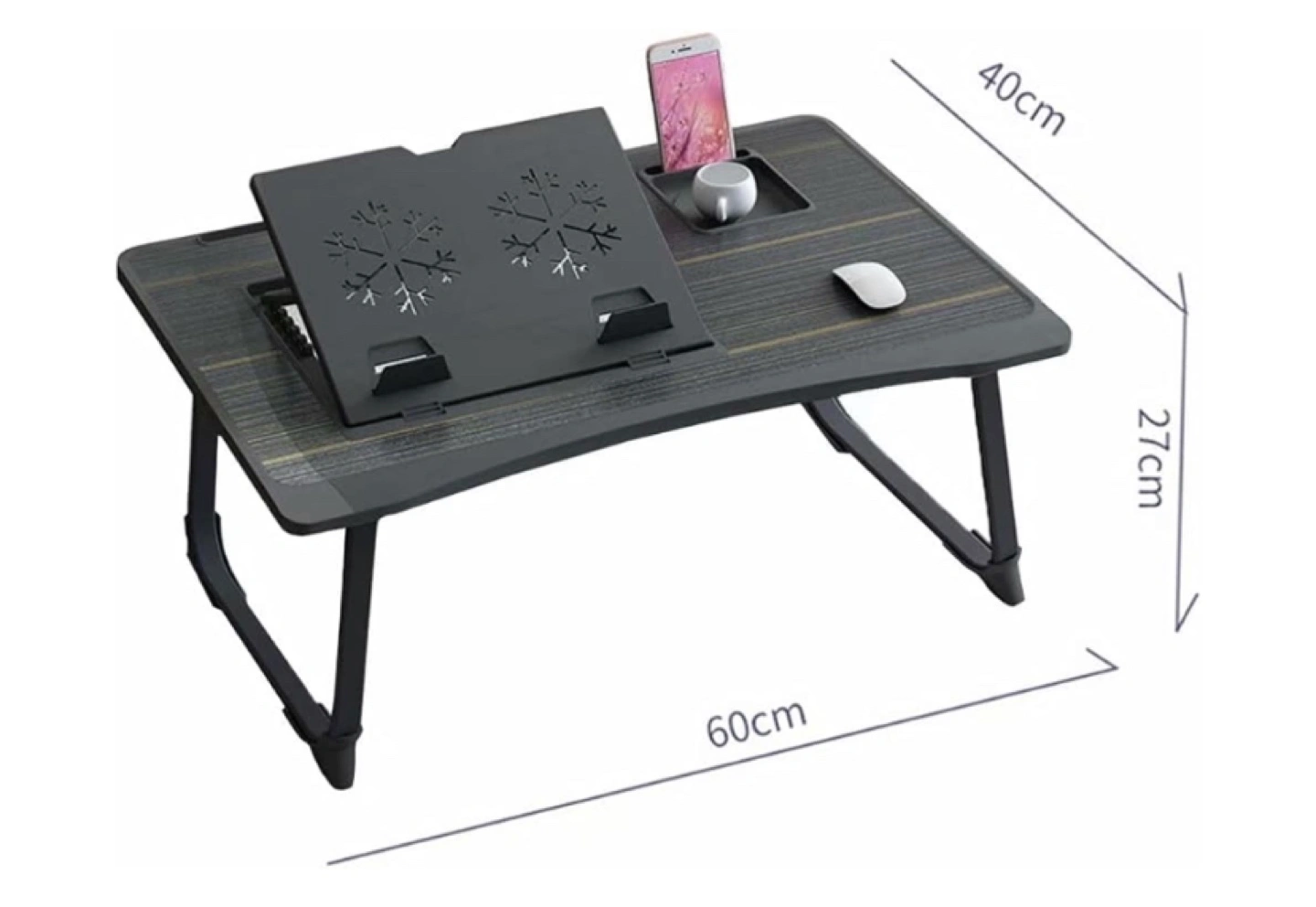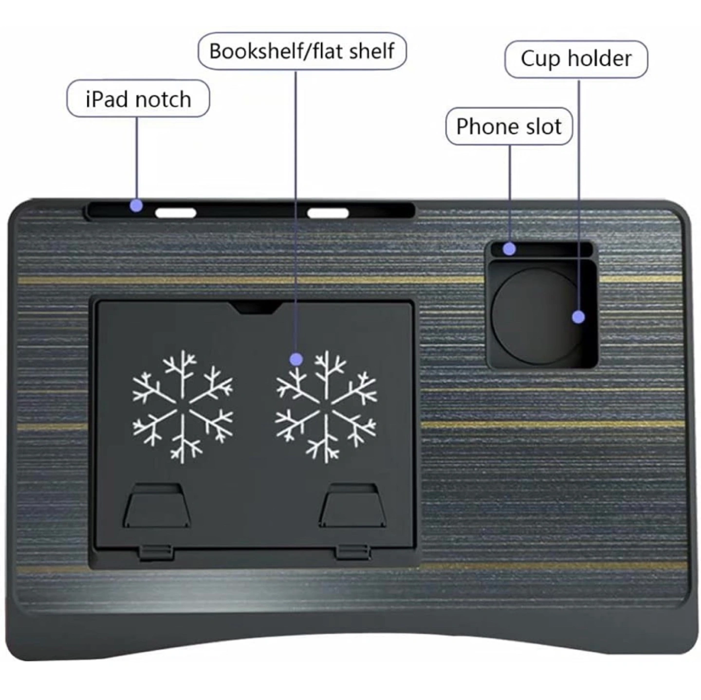 73Portable laptop desk. Features include a cup holder, phone slot, and built-in cooling system. Folds flat for easy storage. Great for working from home or on the go.