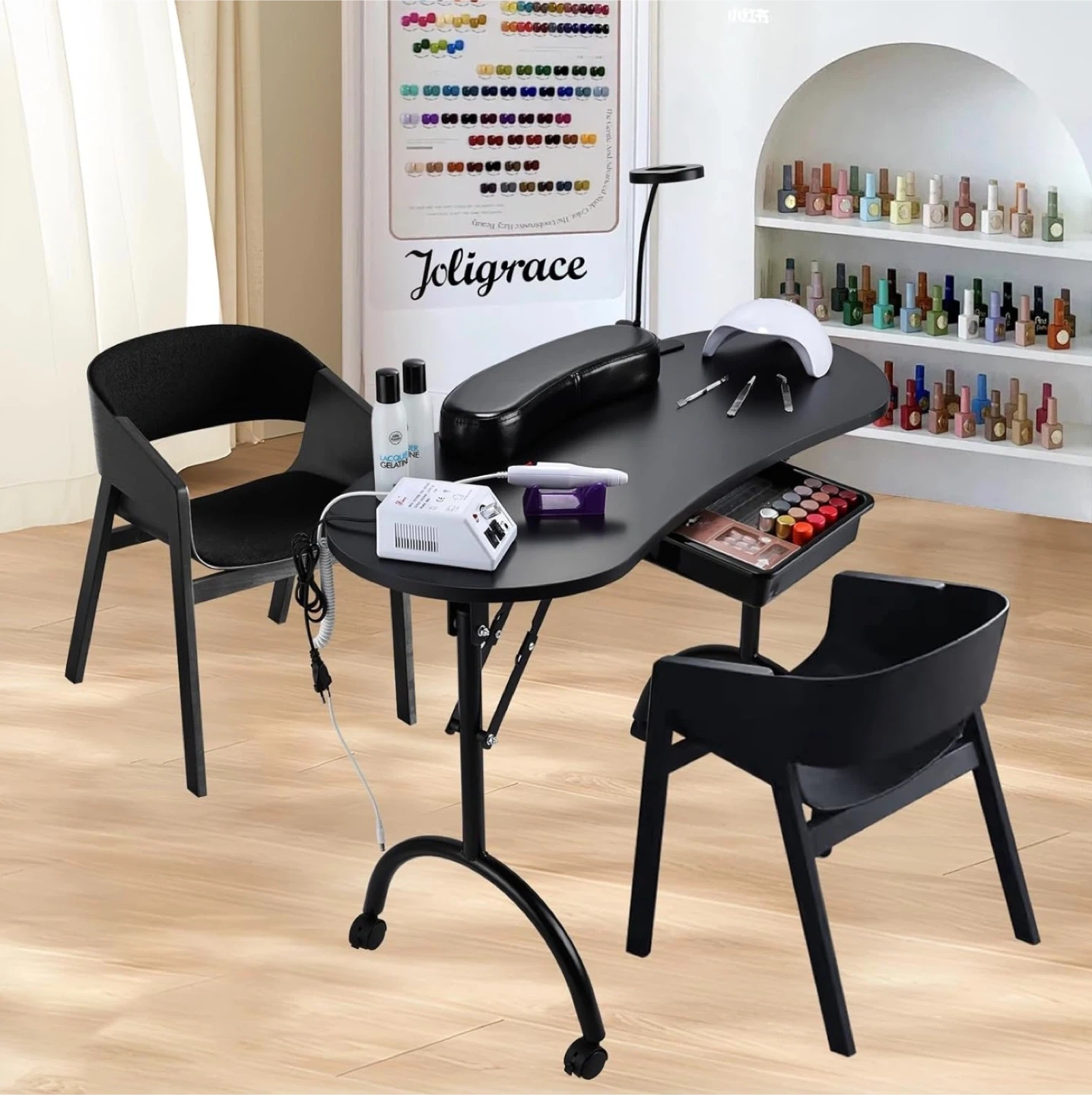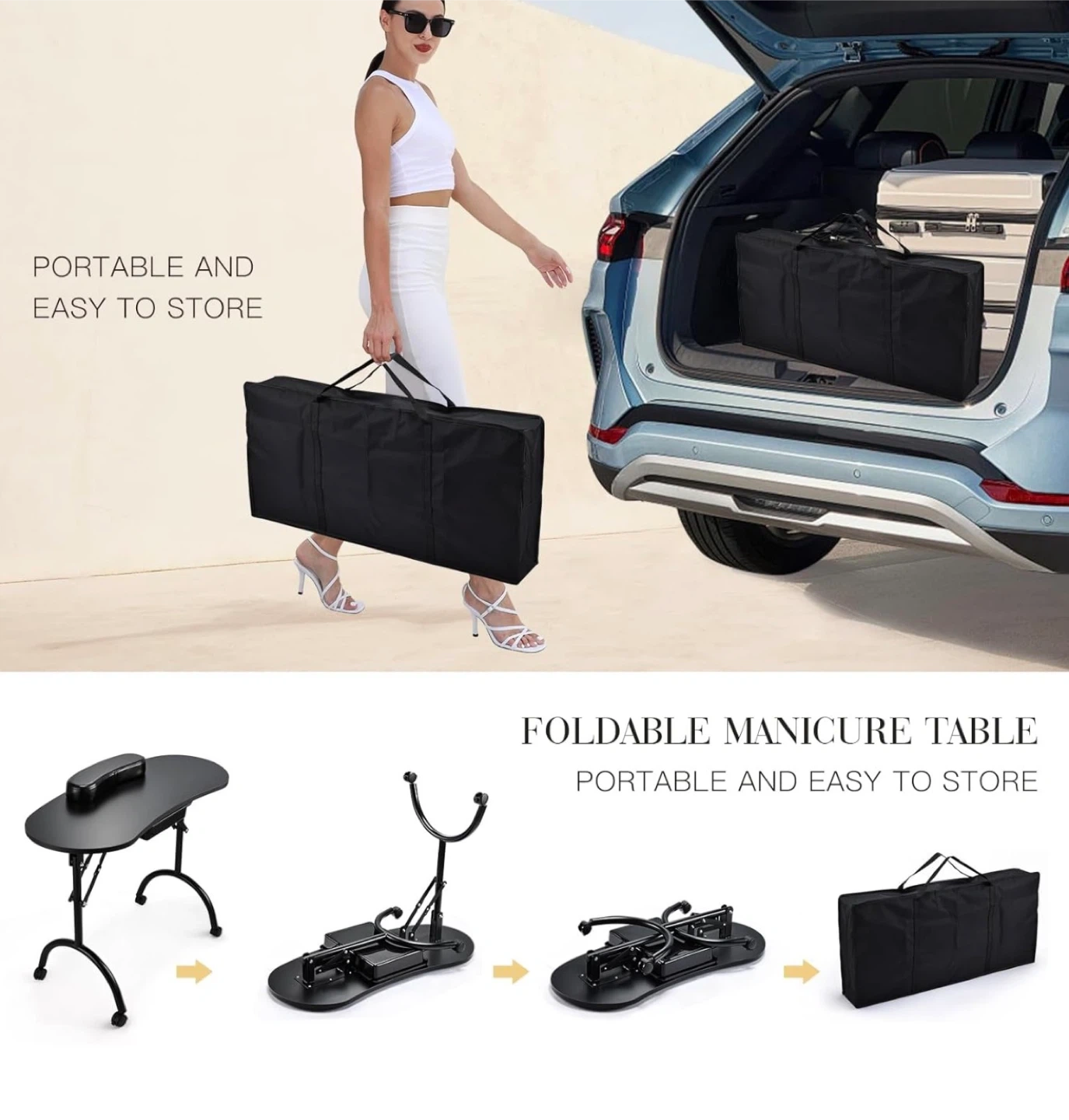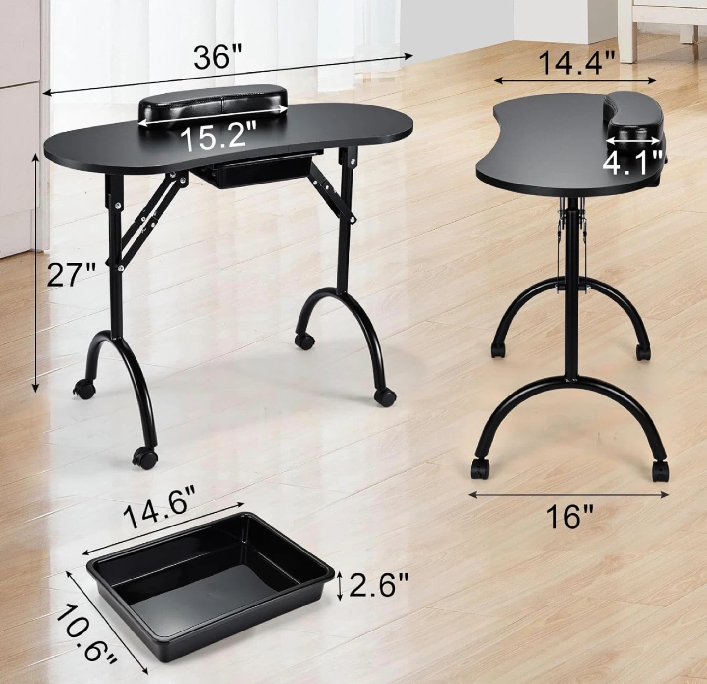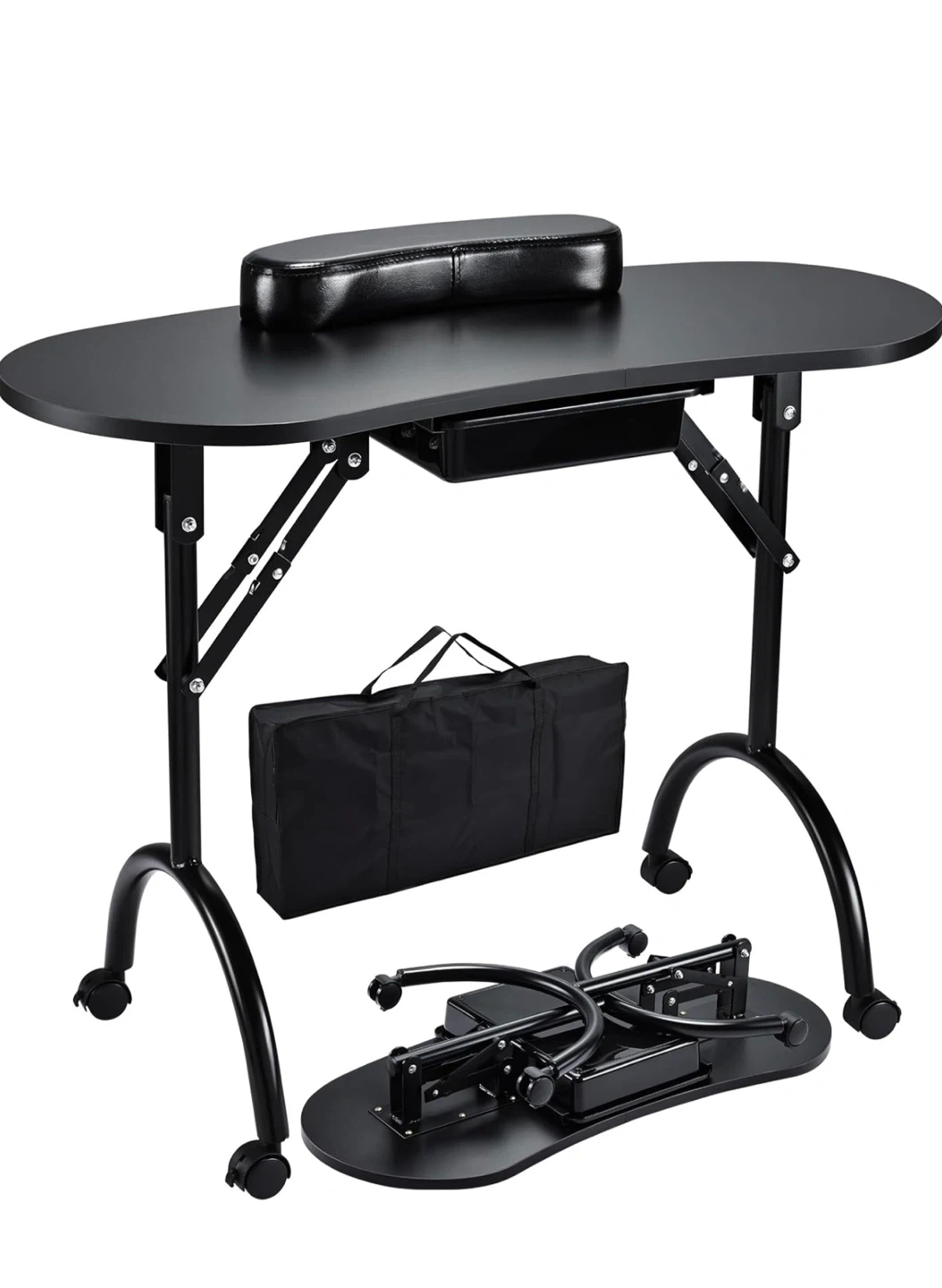 15This foldable manicure table is perfect for anyone needing a portable and easy-to-store workstation! It features a sleek black design and comes with a carrying bag for convenient transport. Mesa de manicura profesional plegable y portátil, escritorio para técnico de uñas, estación de trabajo, 4 ruedas bloqueables con cajón, almohadilla de muñeca para cliente, bolsa para guardarla y transportarla con facilidad.