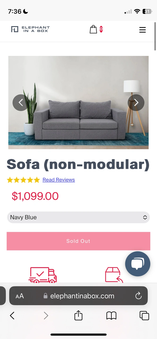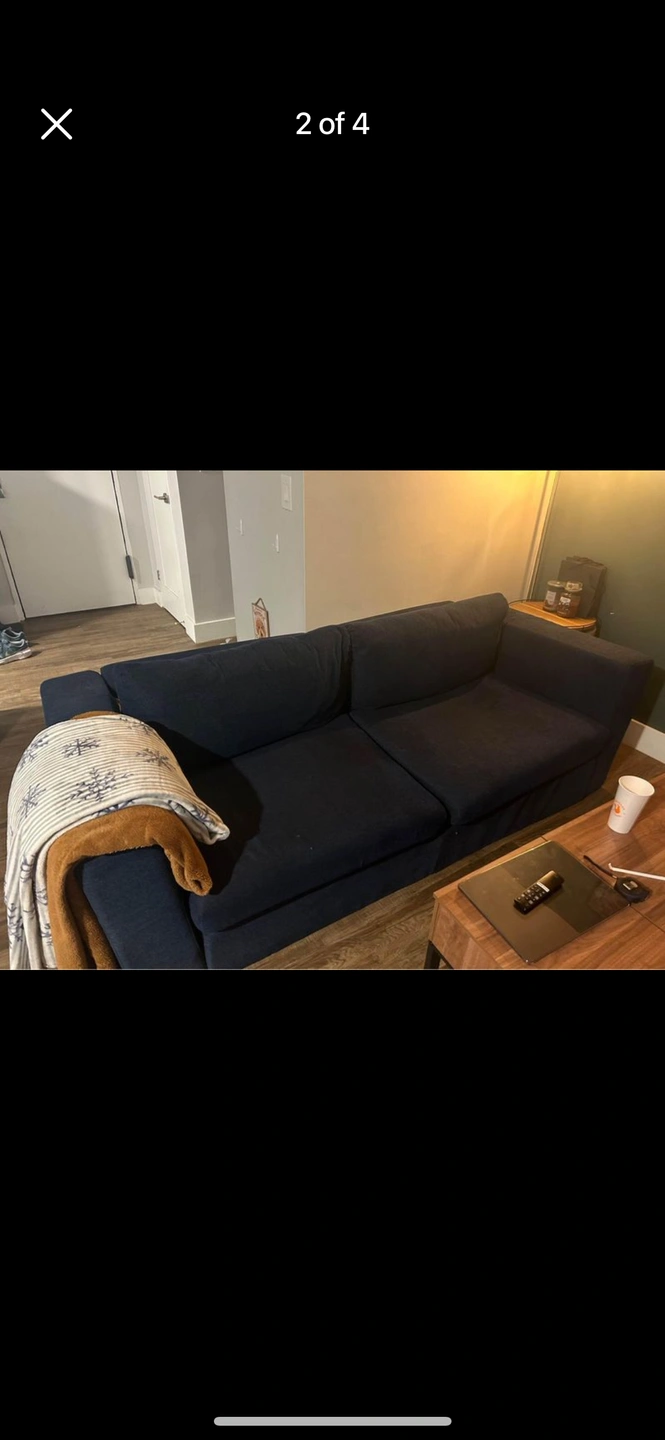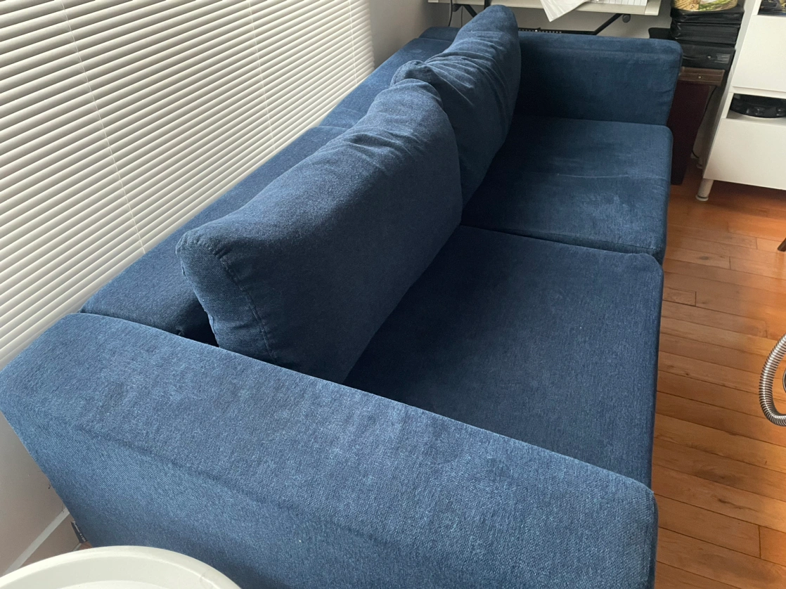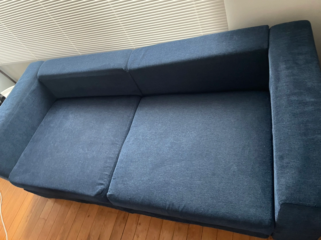 (Write to me when you can pick it up. Must go by Monday, March 25) IT FITS IN A REGULAR CAR because it is foldable. Located in Harlem, Manhattan. $75 Cash only. Pick up on Sun, March 24 btw 7 to 9 pm or Mon, March 25 from 5:30 to 9 pm. If listing is up then it’s available. No need to ask. It is too big for our living room. I just STEAM CLEANED IT for the next buyer to enjoy. The navy blue color is out of stock on their website: https://elephantinabox.com/collections/sofas-1 It is comfortable, fits three people and turns into a bed (see the 2nd pic) when the back pillows are removed. Asking for $75. Retails for $1100. Here is the dimensions right from the website: Sofa: (H) 26.4in x (L) 83.5in x (W) 37.8in Total Sofa Weight: 119lbs We live in an elevator building. Write to me if interested. Will respond to serious inquiries only.
