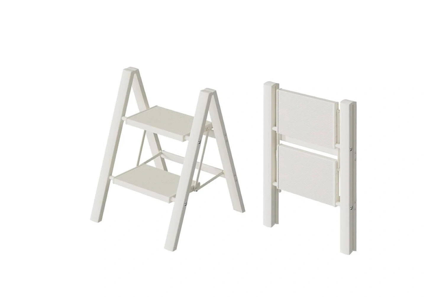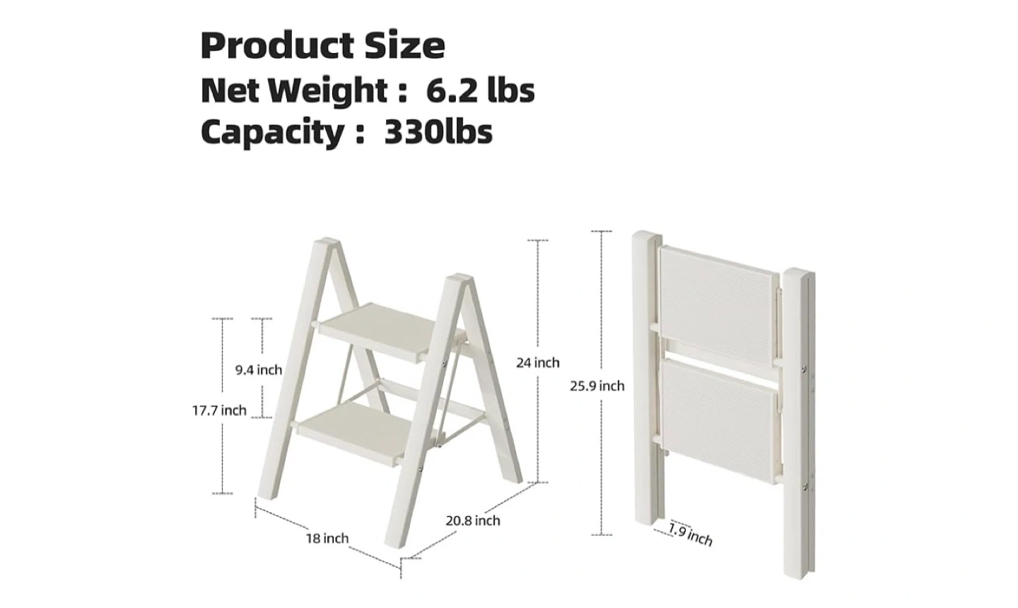 This is a handy folding 2-step ladder stool in white. It features an anti-skid texture on the pedal surface for added safety. When unfolded, each step widens to 7.9 inches. It can hold up to 330 lbs. Folds flat for easy storage!