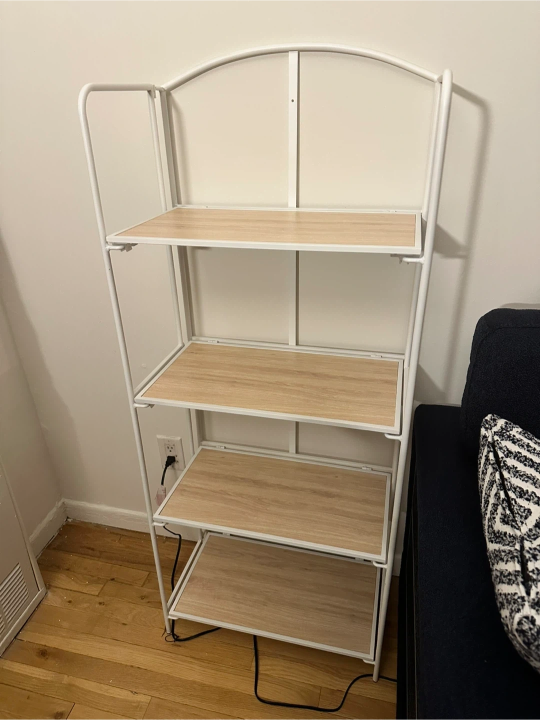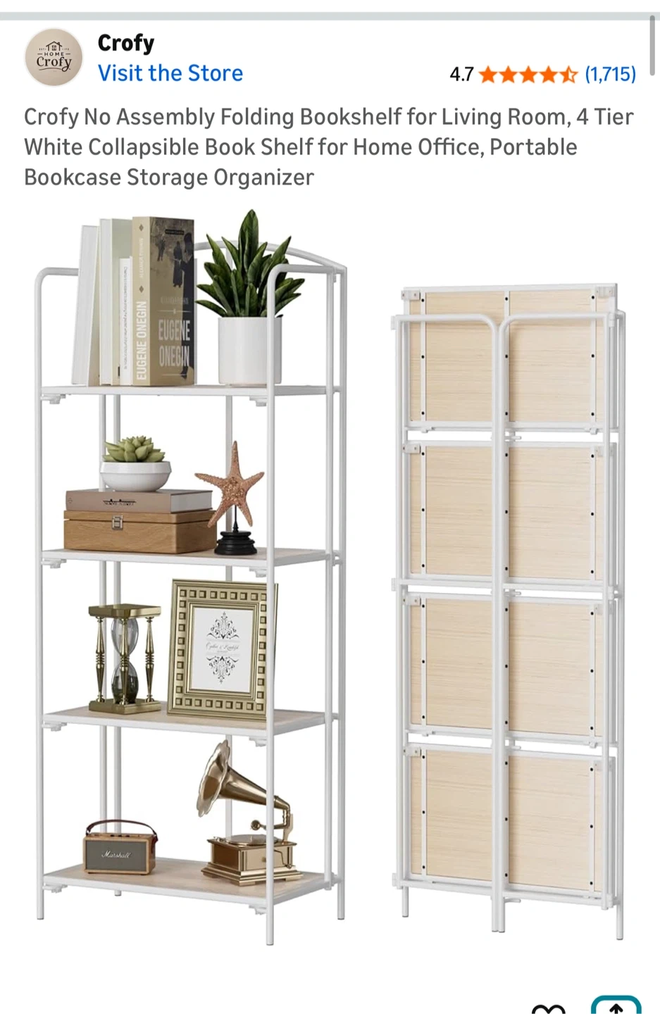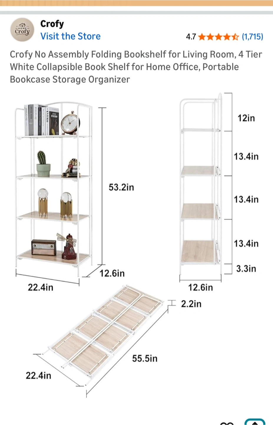 Selling a Crofy No Assembly Folding Bookshelf. It's a 4-tier white collapsible book shelf perfect for a living room, home office, or as a portable bookcase storage organizer. Dimensions: - Height: 53.2 inches - Width: 22.4 inches - Depth: 12.6 inches