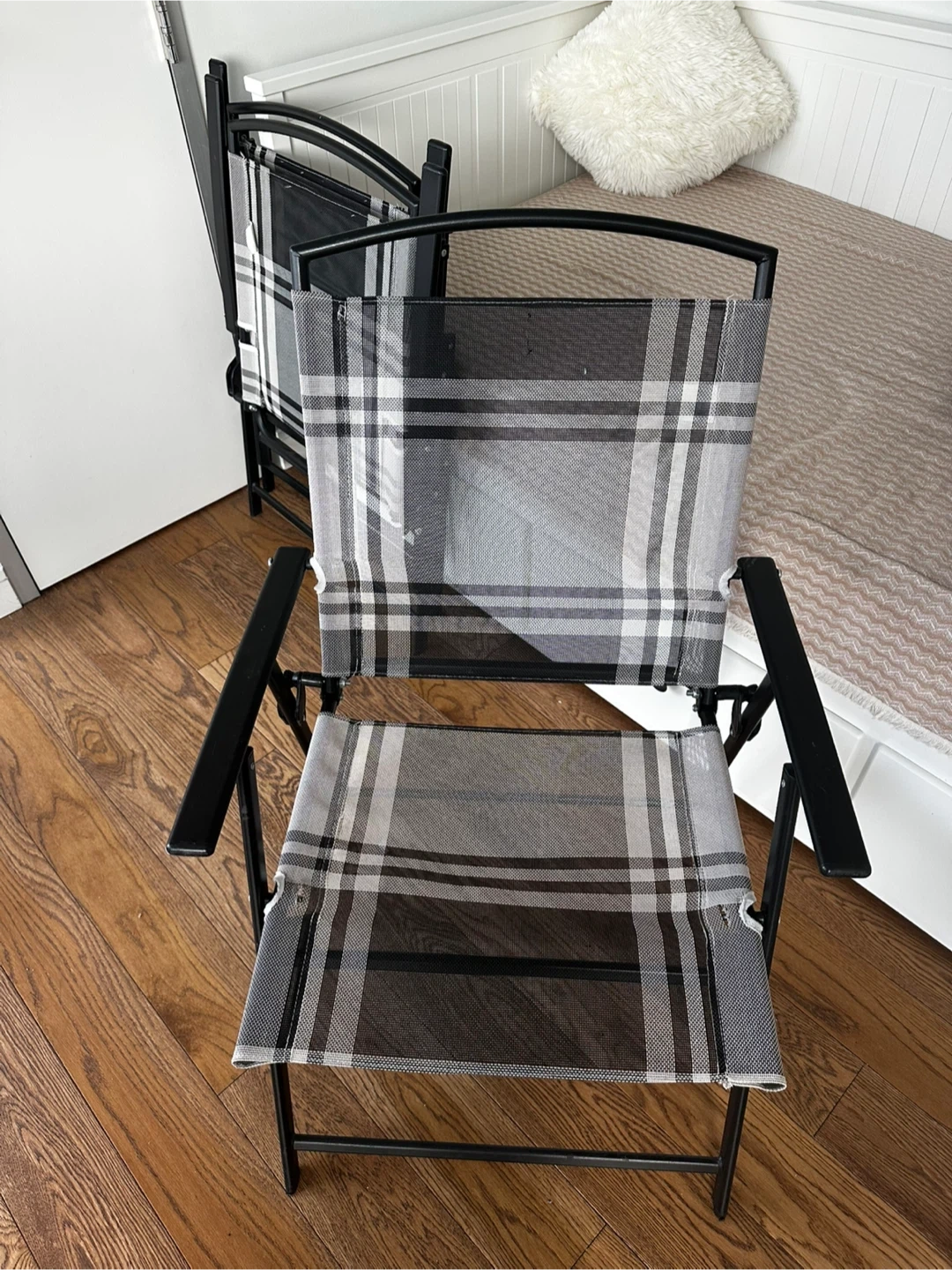 34Selling a folding camping chair with a plaid pattern. It's lightweight and easy to carry, perfect for outdoor activities or relaxing in your backyard. The chair is in good condition and ready for its next adventure! 25$ Each, we have 3 pieces! Pick up only