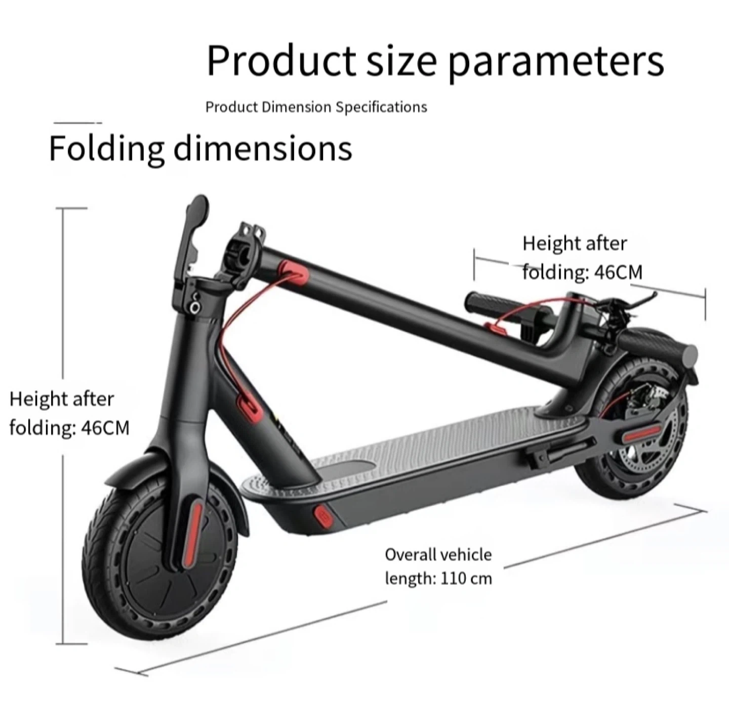 Selling a folding electric scooter in black! The folding dimensions are 46cm in height, making it easy to store. The overall vehicle length is 110cm