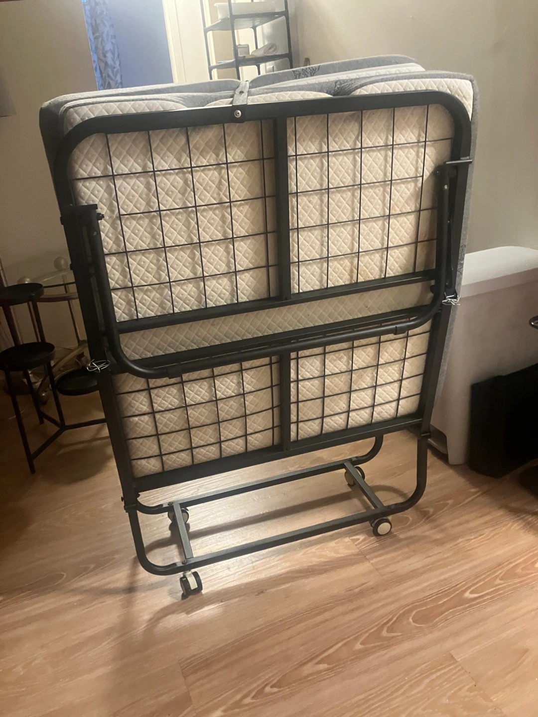 55Selling a folding rollaway bed, perfect for guests or small spaces! It's in good condition and easy to store when not in use. The bed has a sturdy metal frame with wheels for easy maneuverability.