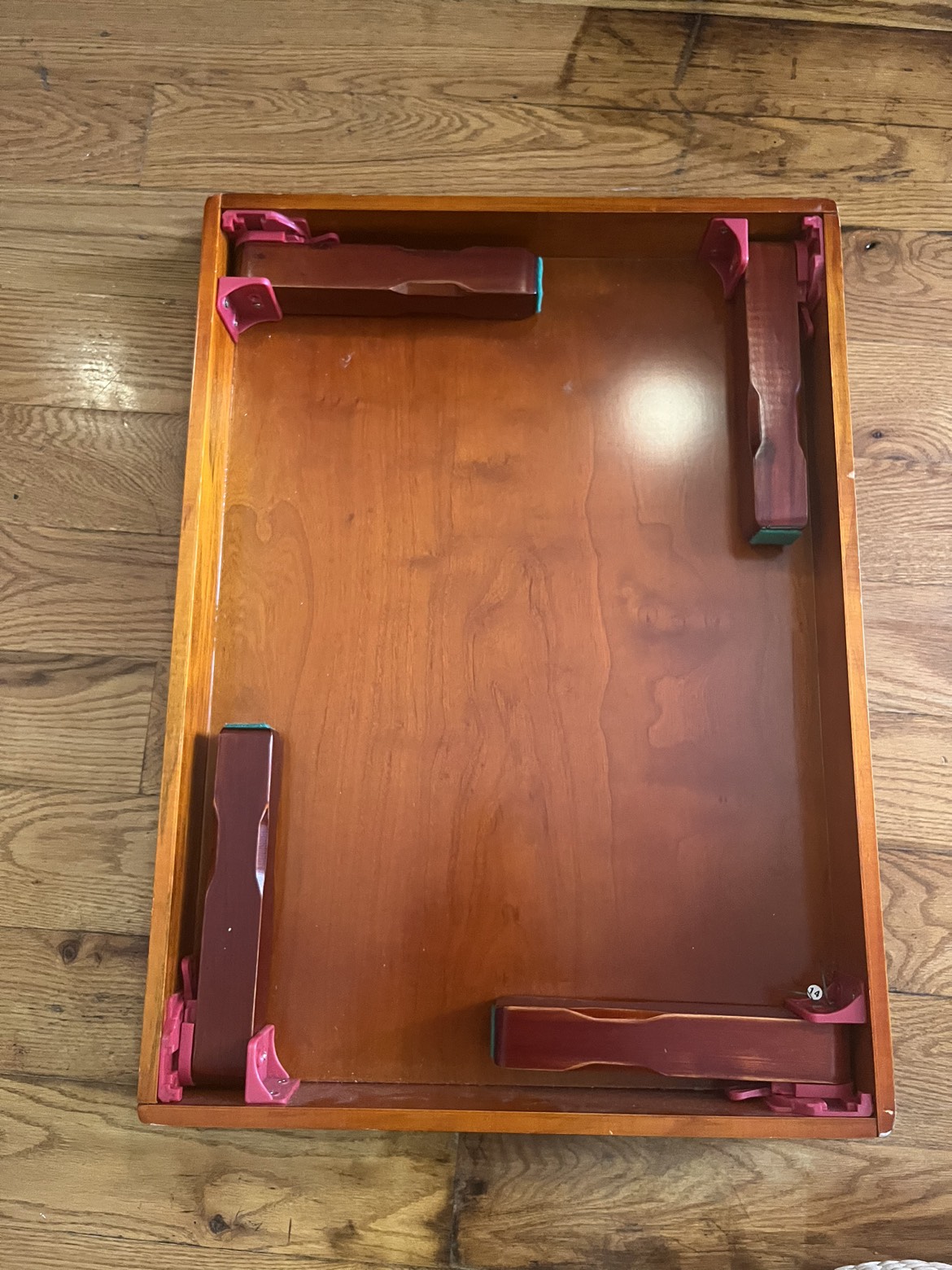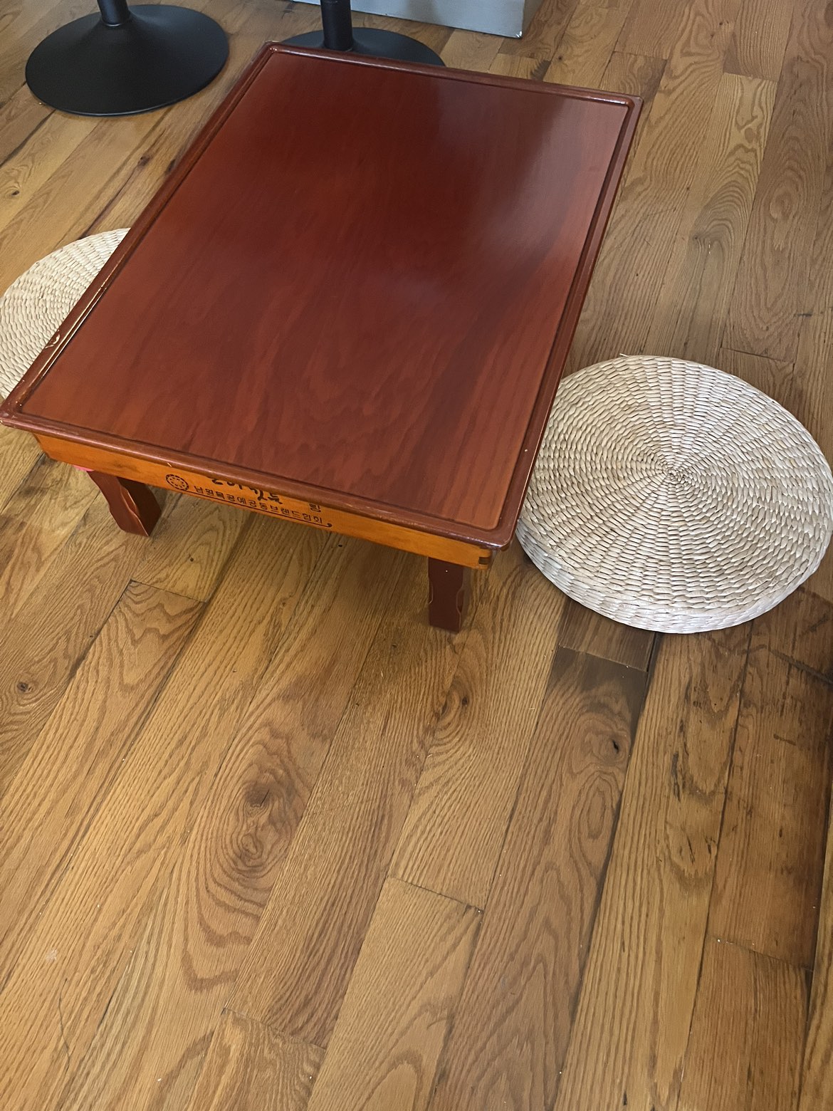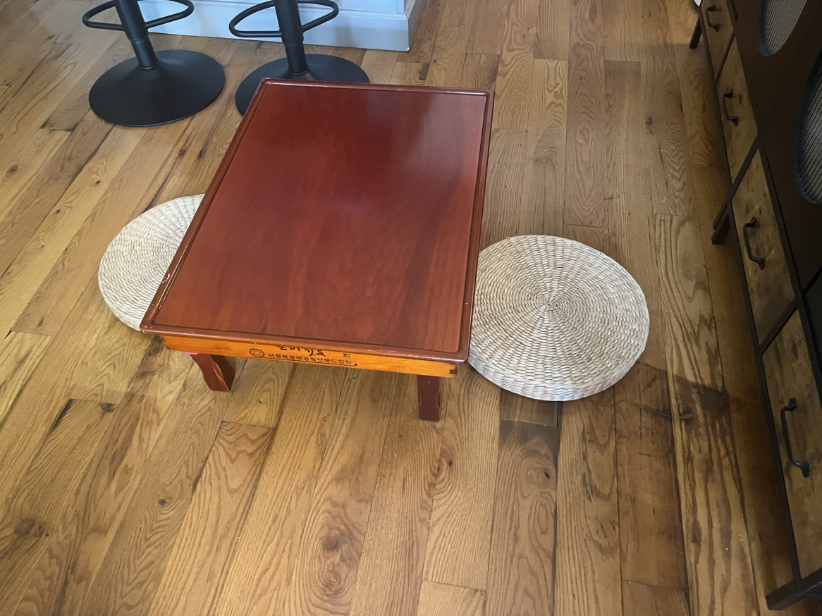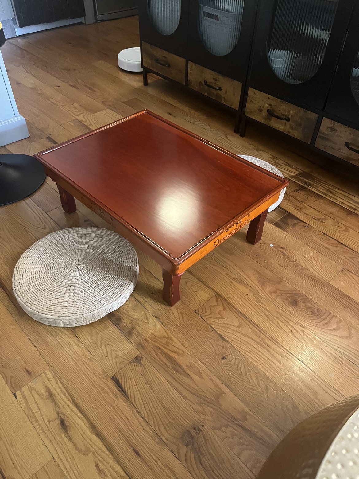 35Folding Wooden Korean Tea Table. Also comes with little seating pads. Very good condition. Easy carry on subway or taxi. https://www.amazon.com/dp/B0722TZ48M?ref_=cm_sw_r_apin_dp_68AZYYVHQG5XNSBVMQ0F 19"D x 26.5"W x 10"H Excelife foldable multi Korean traditional tea table is made from kalopanax. It is multi functional table for eating, studying and use laptop. Rich brown color and natural wood grain finish, is perfect table to complement any room. And, easy storage for any tight space. Japan, Chinese.