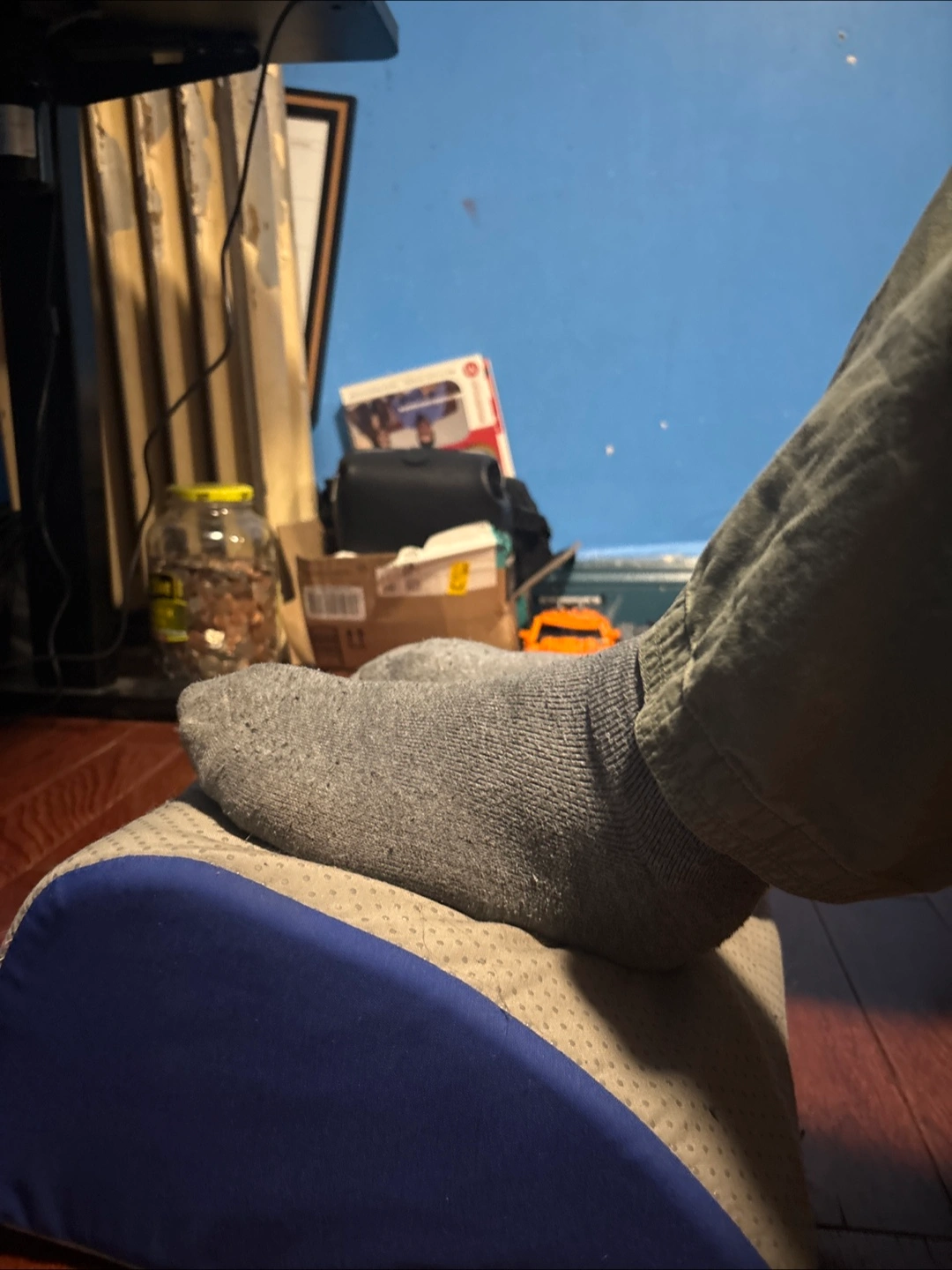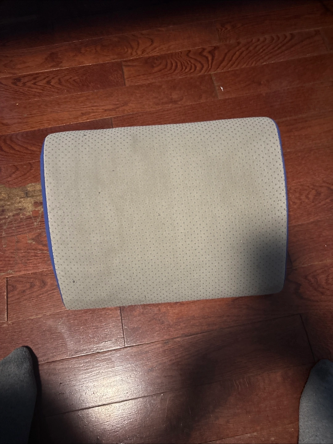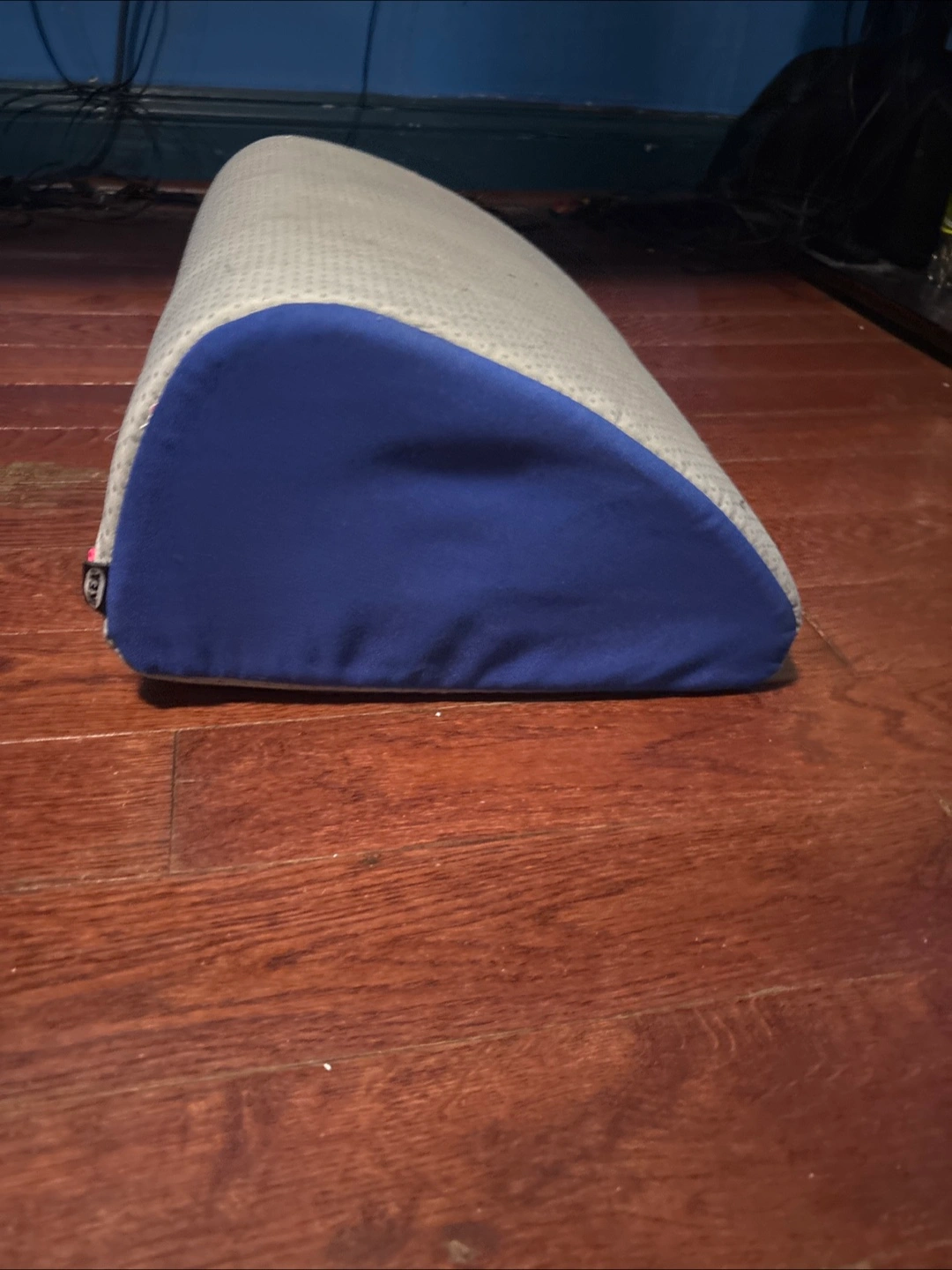 5This is a foot rest pillow in blue and gray. It appears to be in good condition and could be used for foot and leg support while sitting at a desk or vanity.