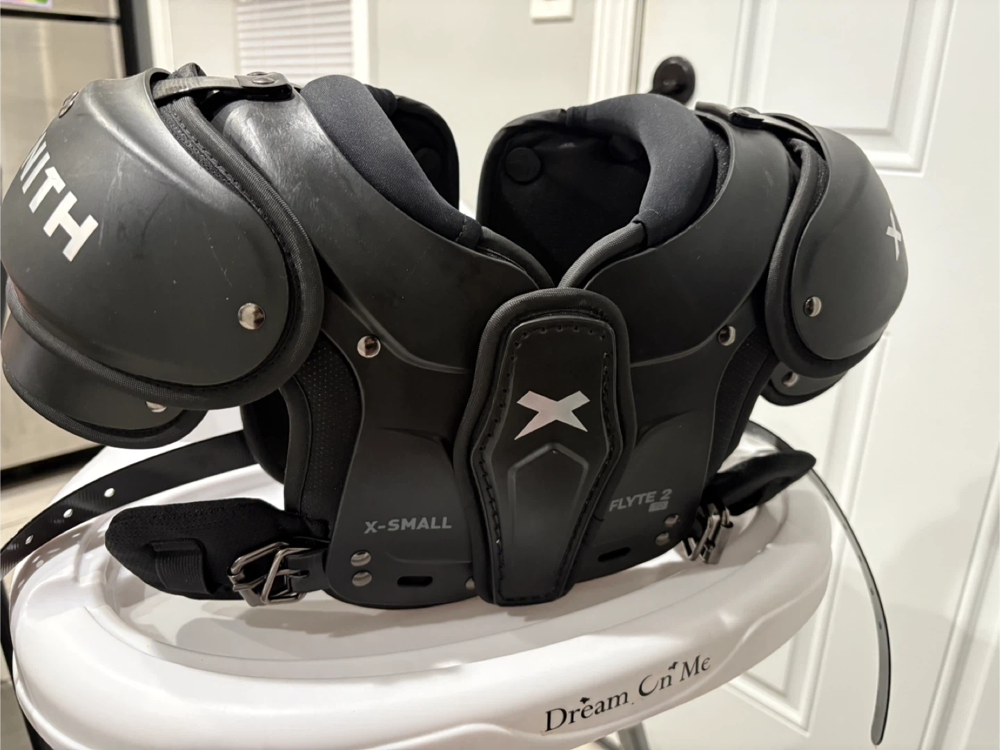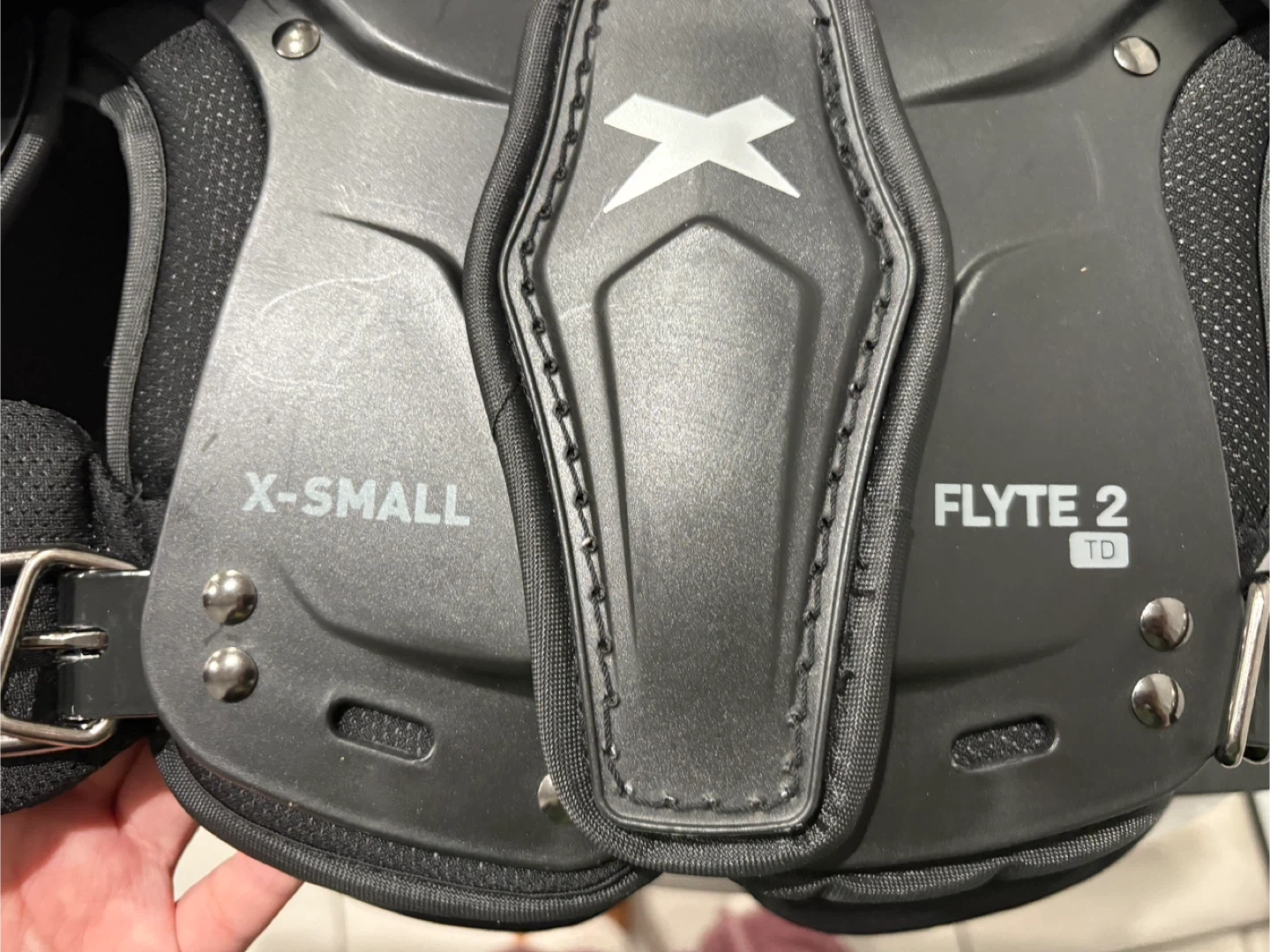 65Vendo una hombrera de fútbol americano Xenith Flyte 2 TD talla XS. ¡Está en perfecto estado y lista para usar! La etiqueta original dice $109.99. Me costó $80. Es nueva. I'm selling a Xenith Flyte 2 TD football shoulder pad in size XS. It's in perfect condition and ready to wear! The original tag says $109.99. It cost me $80. It's brand new.