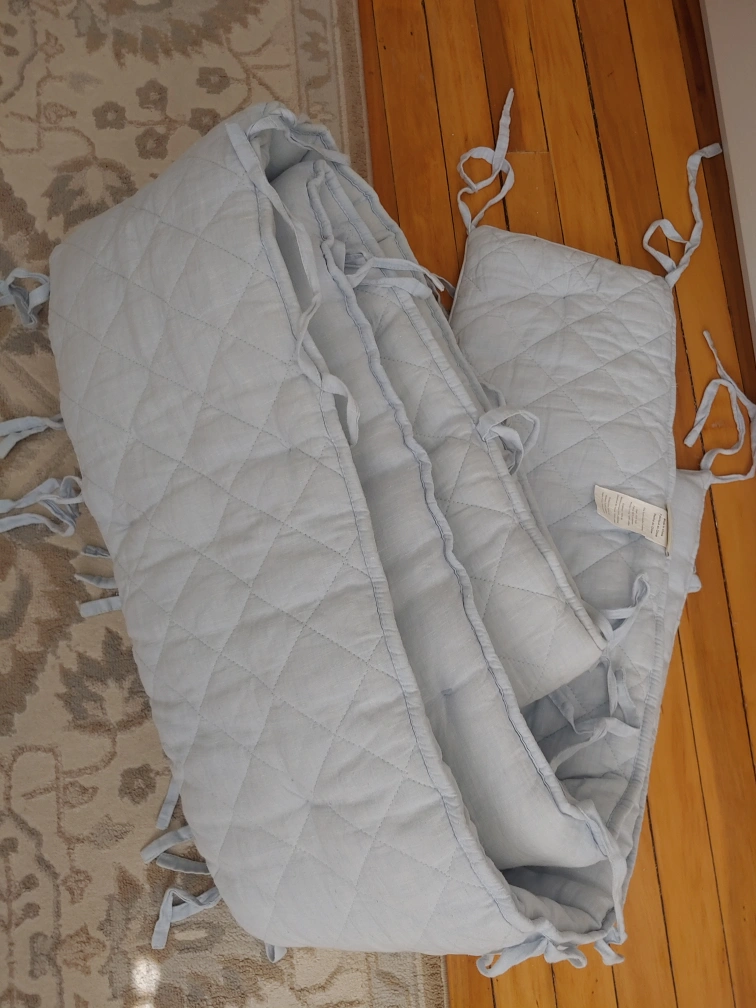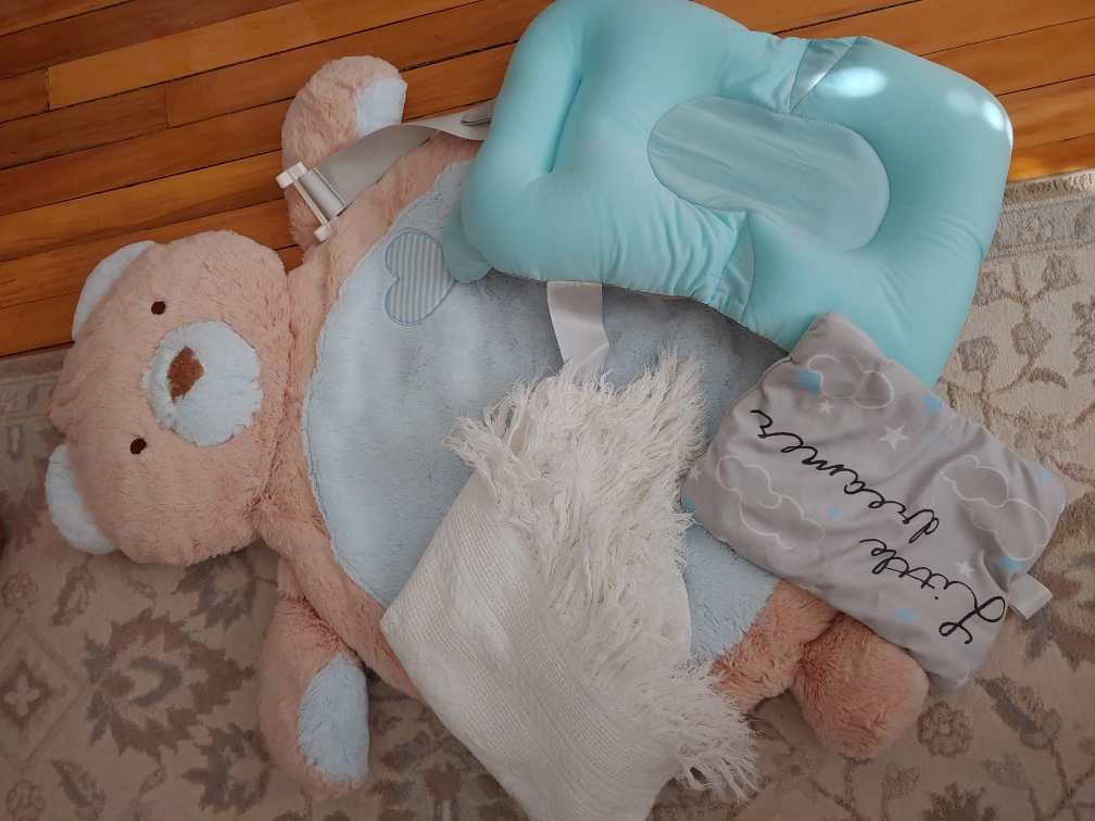 Bumper, crib valance, pillow, new lying mat, new bathtub liner, blanket