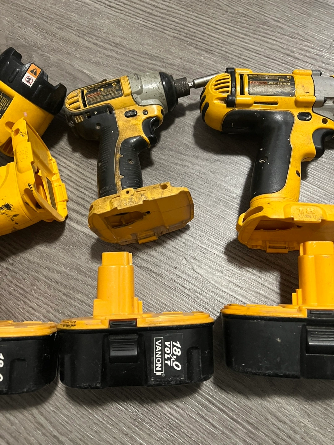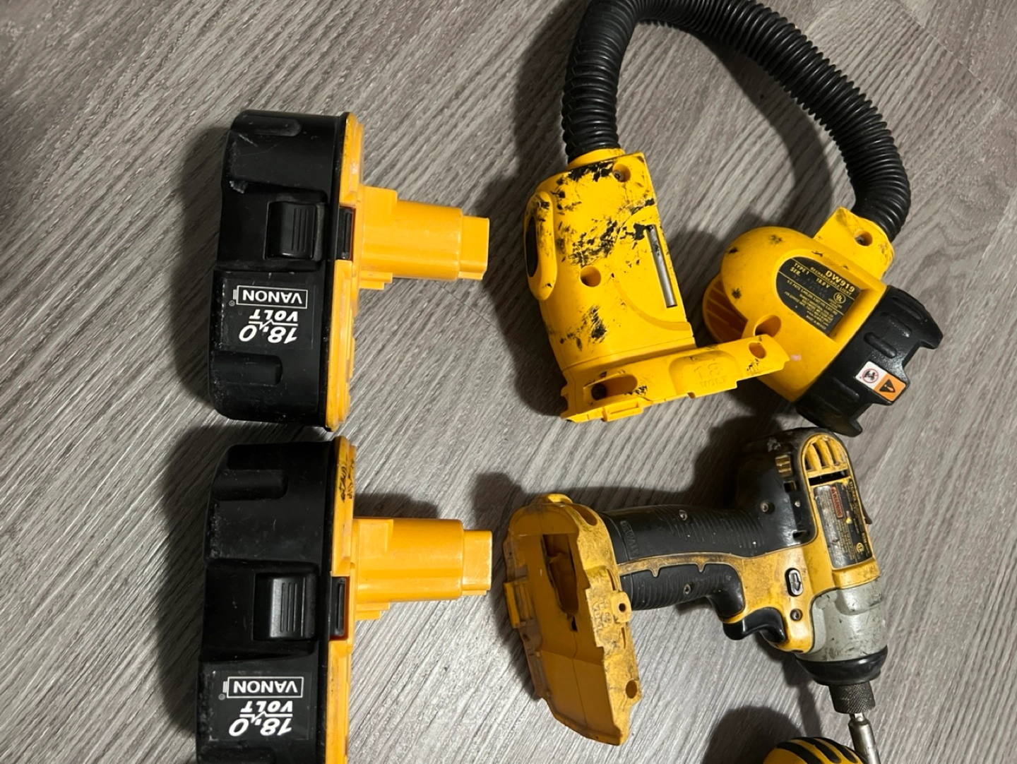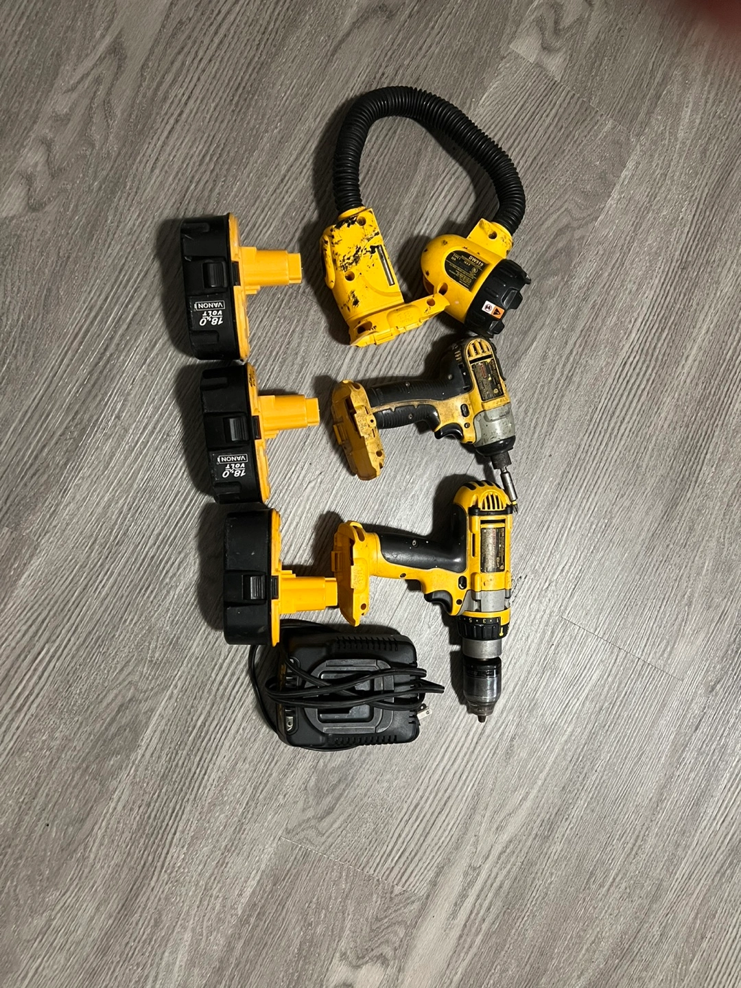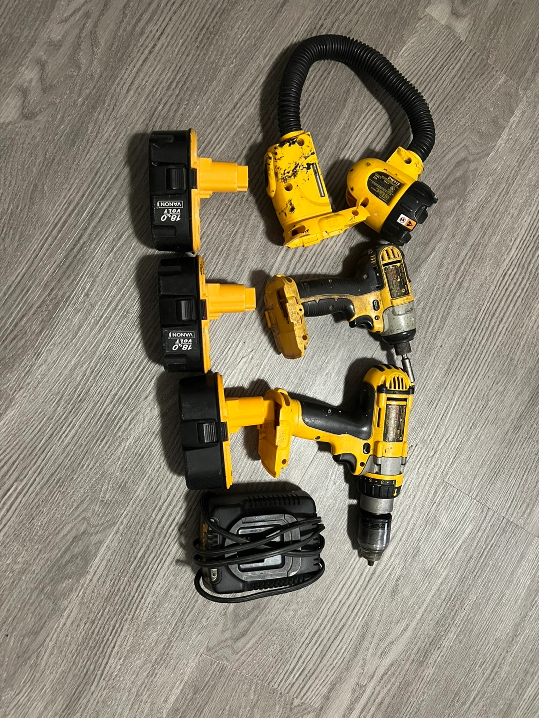 47Used Dewalt 18V drill, impact driver, and work light. Includes multiple batteries and charger. Some wear and tear.