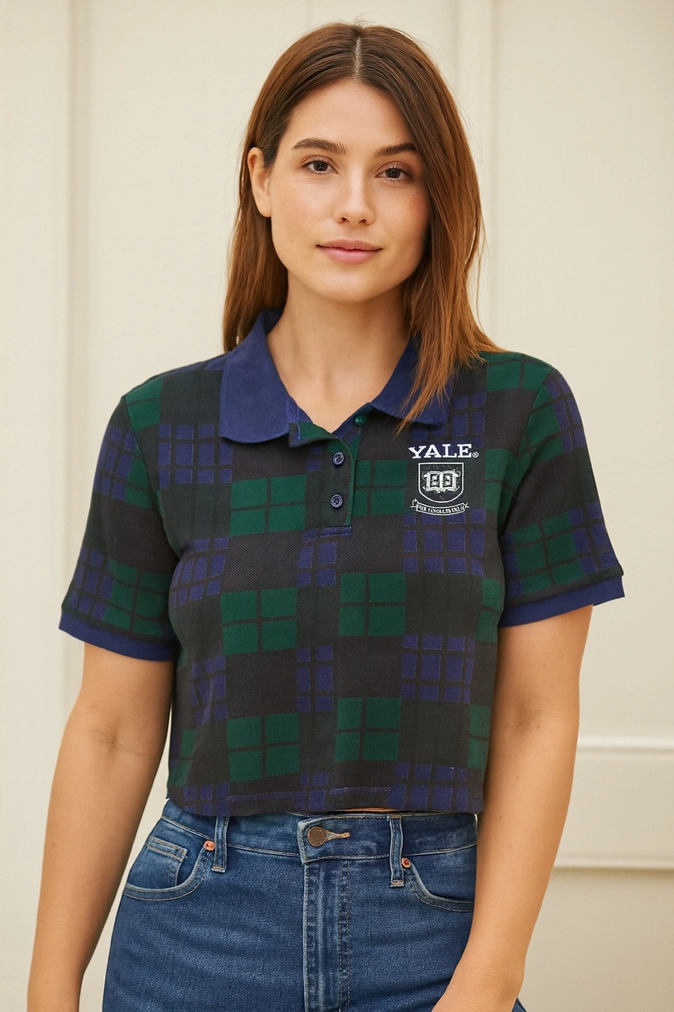 Selling a cute Forever 21 crop top in a green and blue plaid pattern. It's a size small and features a Yale logo. Perfect for a casual, preppy look! Yale Plaid Cropped Polo Size small knit top featuring an allover plaid pattern, basic collar, partial button-front placket, short sleeves with contrast trim, chest embroidered Green and blue colors Preowned but barely worn…