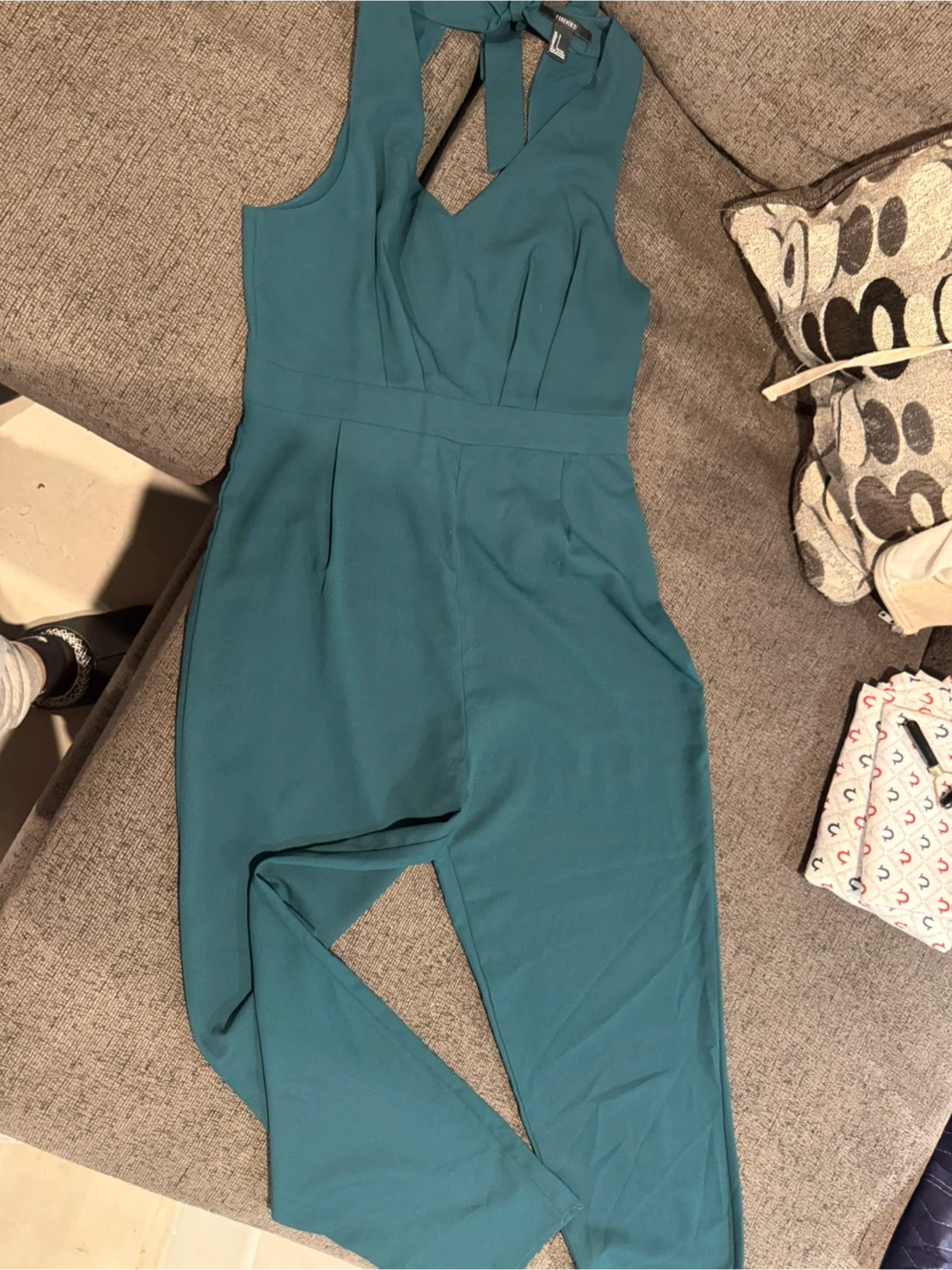 60Selling a cute Forever 21 jumpsuit in a beautiful green color! It's a size L and features a stylish tie detail at the back. Perfect for a night out or a special occasion