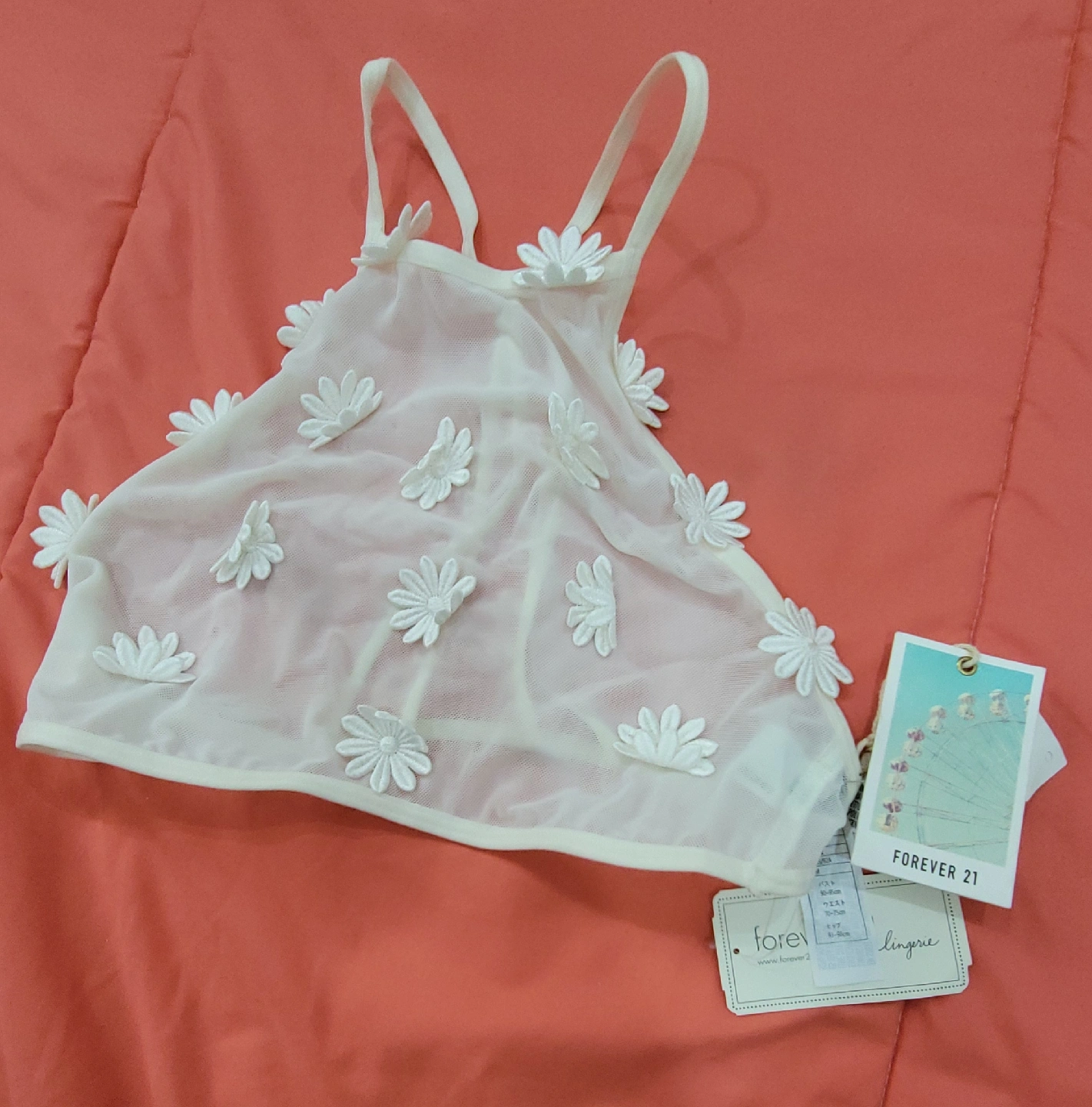 15Selling a Forever 21 lingerie top in size small. It's a cute, sheer white top with flower details. New with tags!