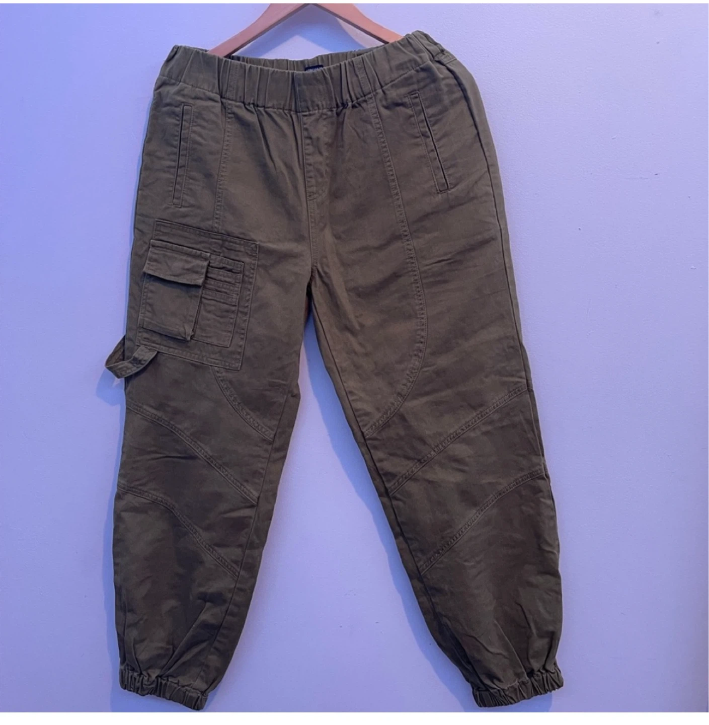 21Selling a pair of Forever 21 cargo pants in olive green. They're a size large and in great condition! Perfect for a casual, comfortable look.