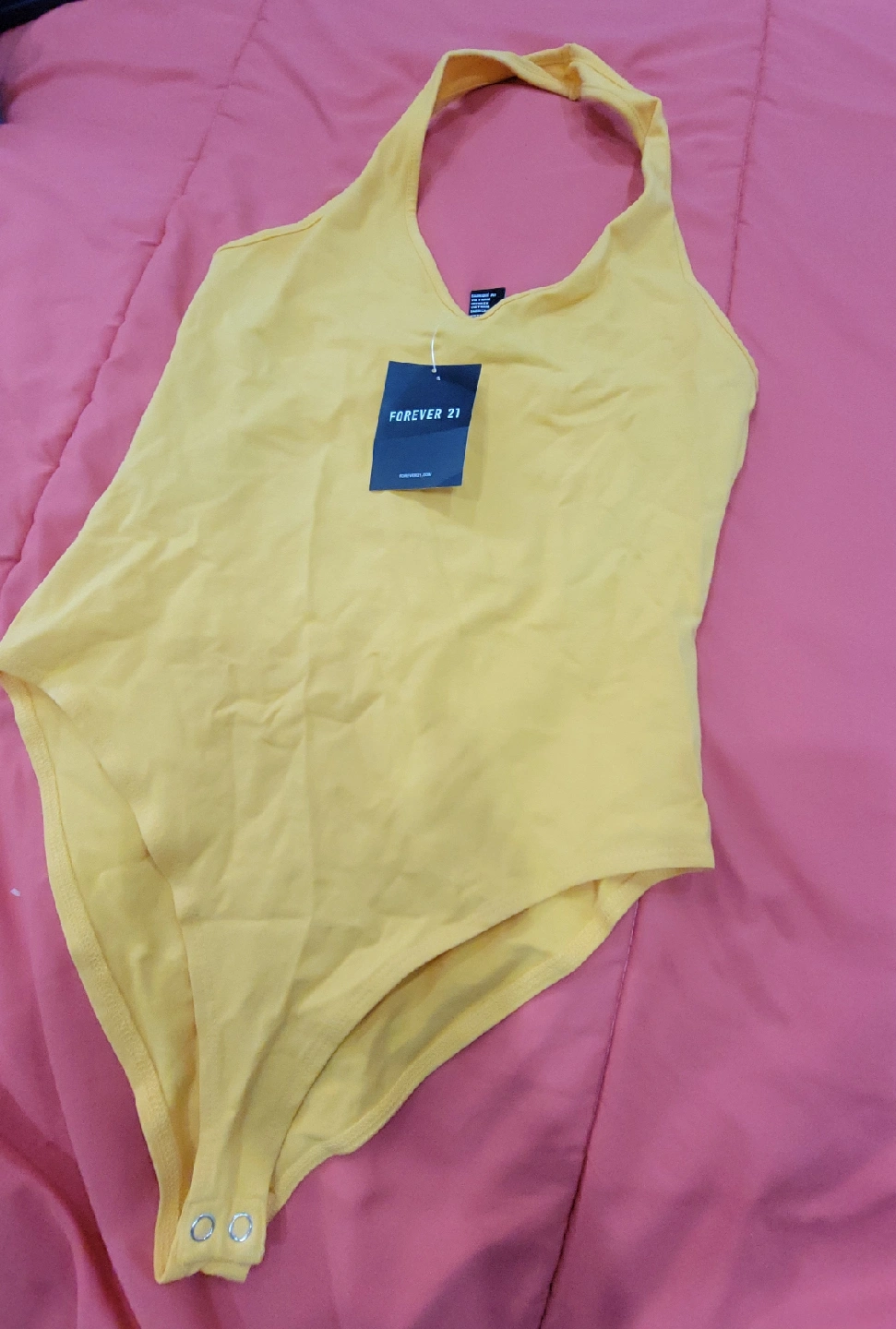 15Check out this brand new Forever 21 yellow halter bodysuit! It still has the tags on it, so it's in perfect condition. It's a vibrant yellow color and would be a fun addition to any wardrobe