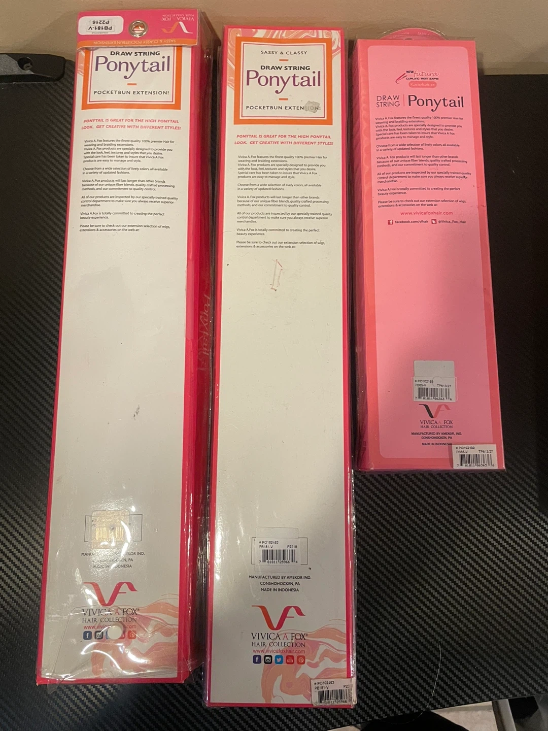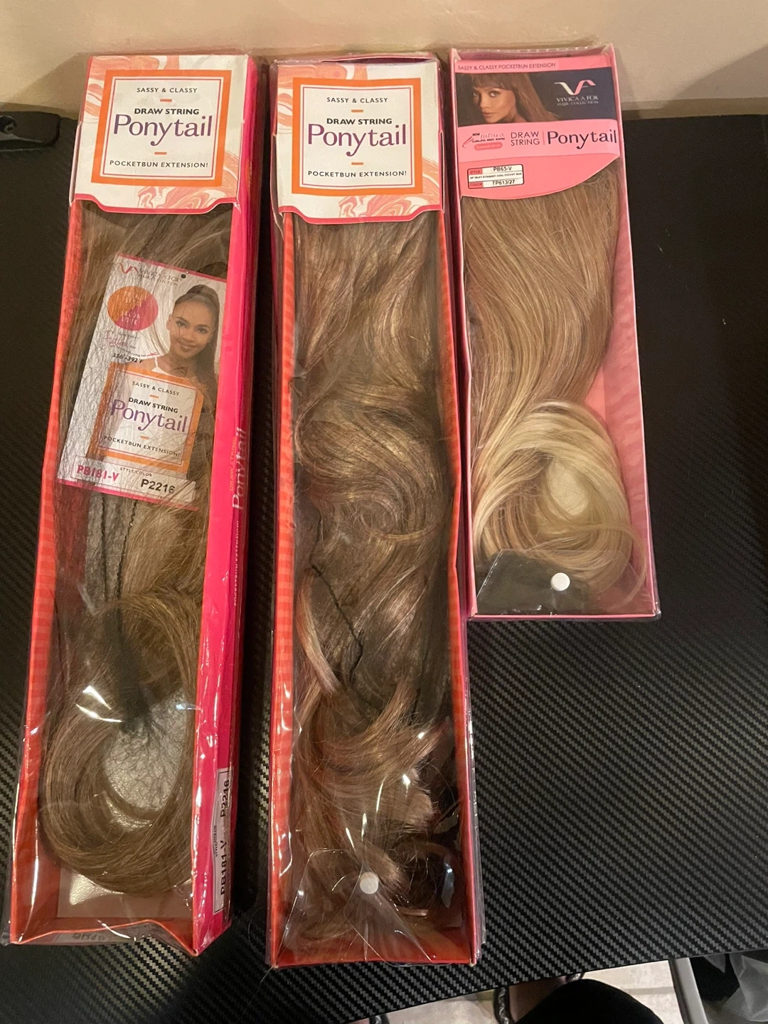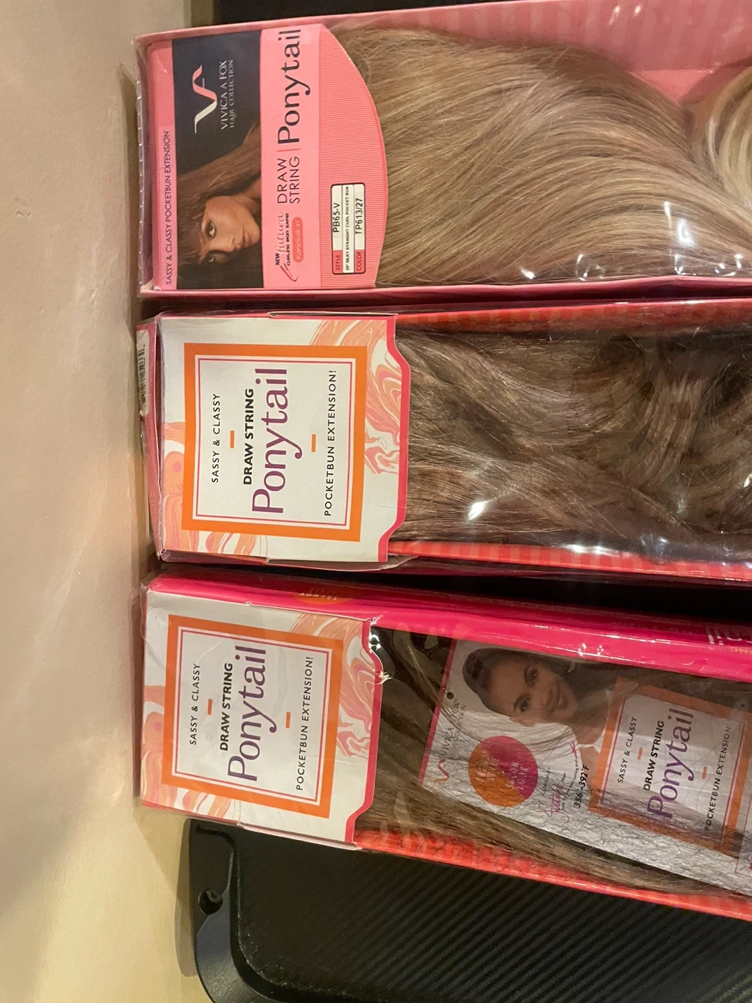 66Selling a selection of ponytail hair extensions from Forever Young and Vivica Fox. These are draw string ponytail pocket bun extensions. They're perfect for adding volume and length to your hair quickly and easily! All these are new never used prices vary, I am very fair and reasonable with my prices