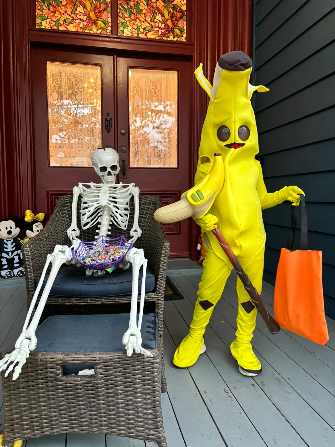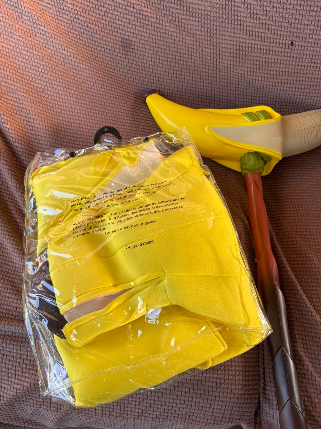 Selling a Fortnite Peely banana costume! It's a fun and recognizable outfit for any Fortnite fan. Includes the costume and inflatable harvesting tool