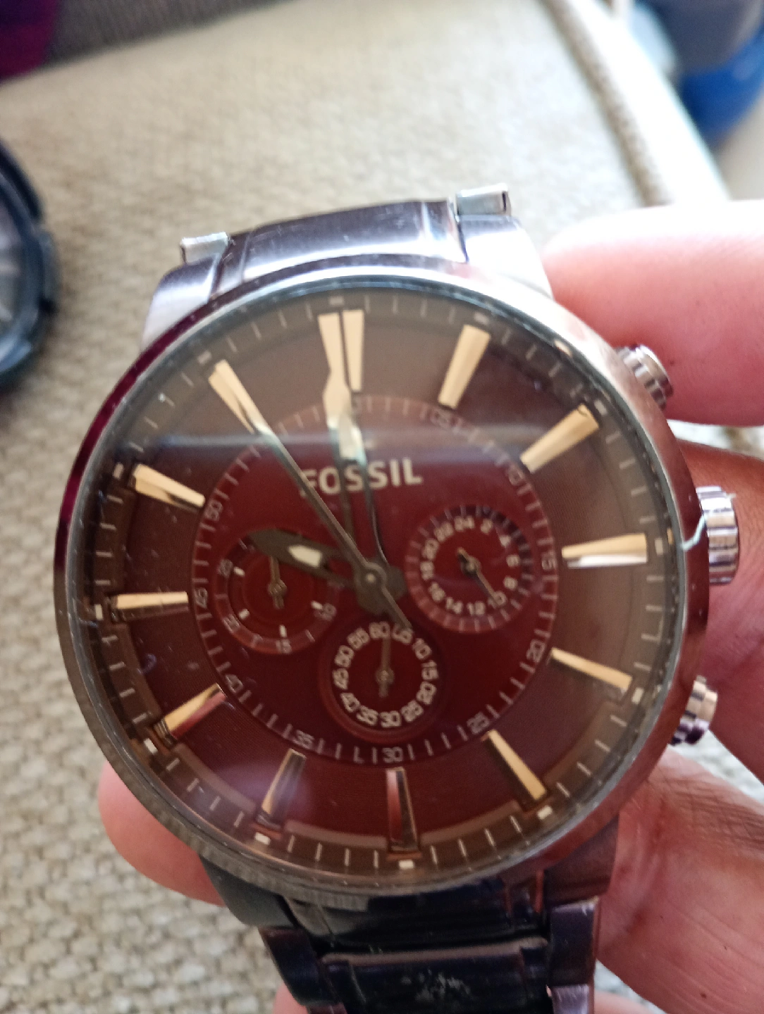 Selling a Fossil watch with a brown dial and stainless steel band. It has some signs of wear on the band, but the face is in good condition. Stylish and functional! . original it's might need a wrist band and battery bingo