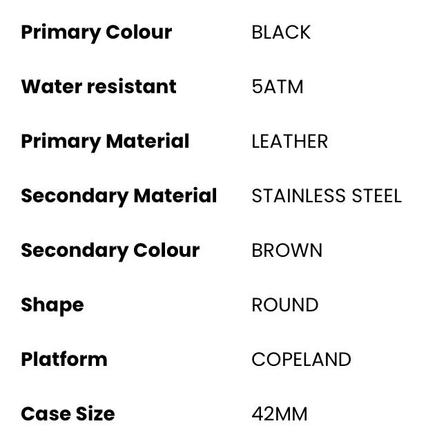 65This 42 mm Copeland features a black sunray dial with a genuine amber crystal, three-hand movement and a brown leather strap. 12-Hour Dial, Luminous Hands, Water-Resistant 50 m (5 ATM).