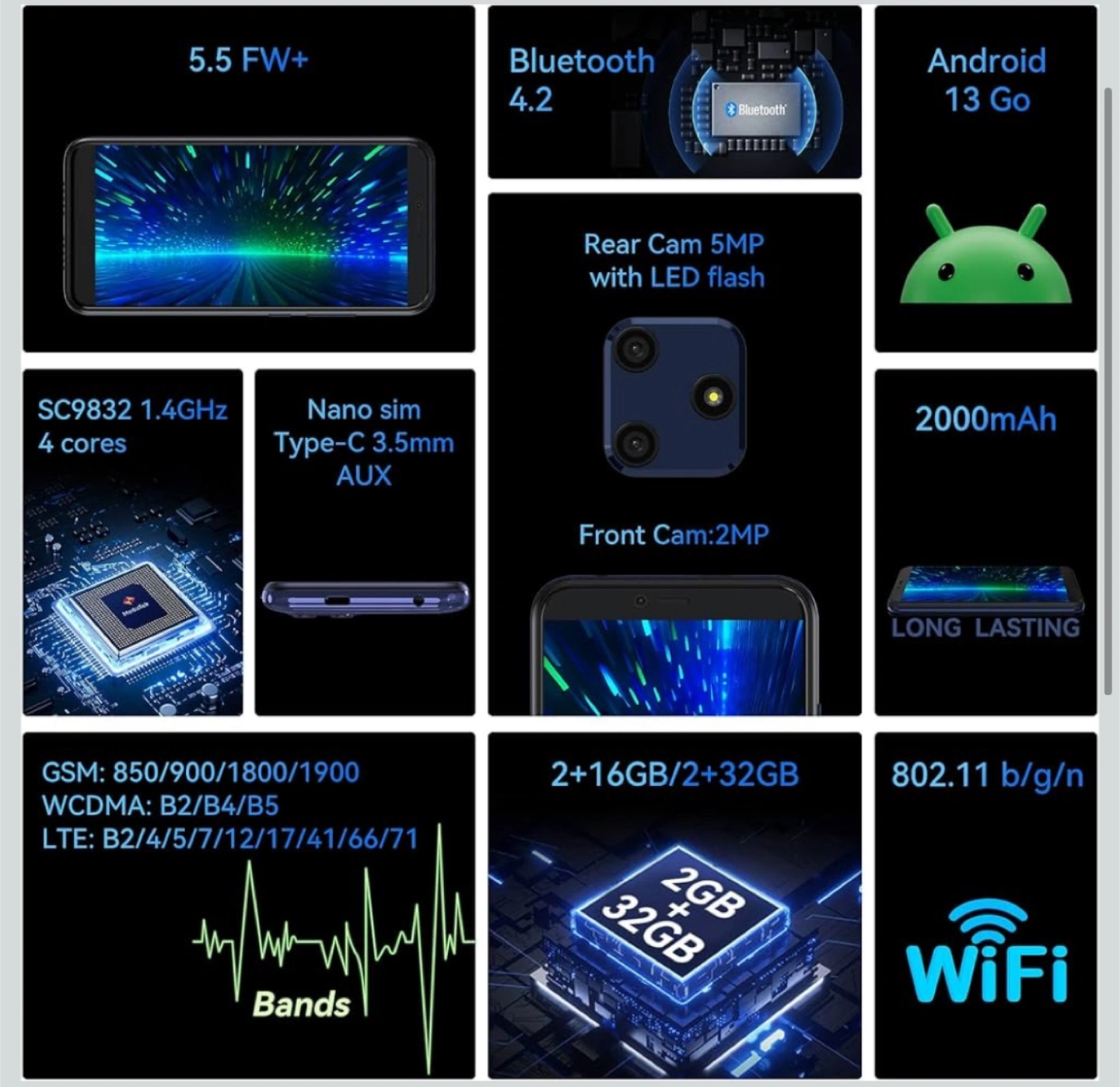 64Selling a Foxx A56 smartphone. Brand new sealed. It features a vibrant 5.5" display, perfect for watching videos or browsing the web. Key features include: - Android 13 Go - 2GB RAM + 16GB storage - 5MP rear camera with LED flash - 2MP front camera - 1.4GHz Quad-Core processor - Bluetooth 4.2