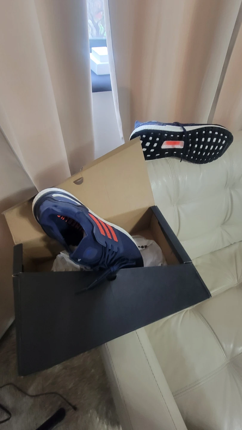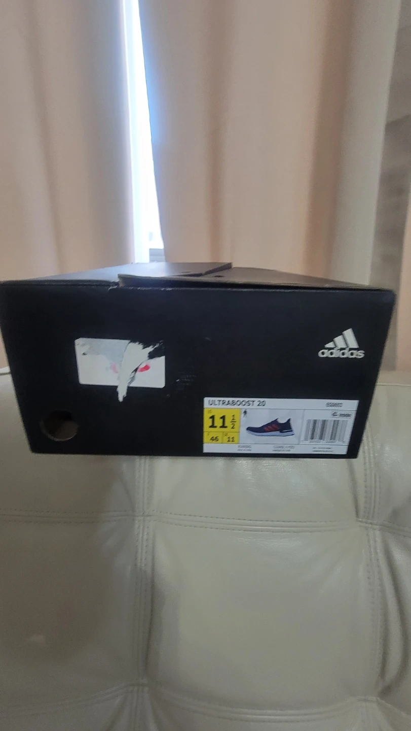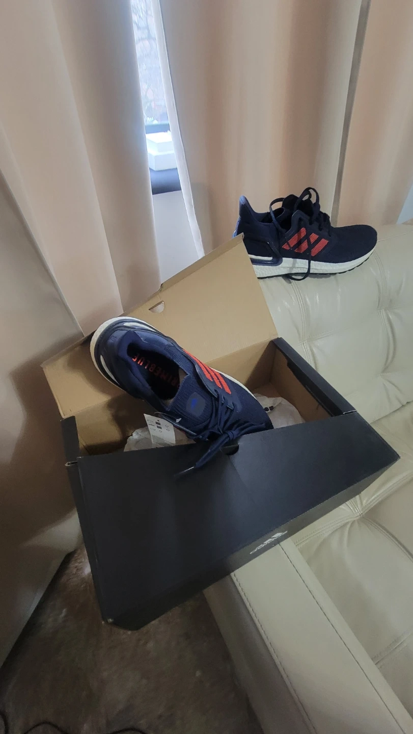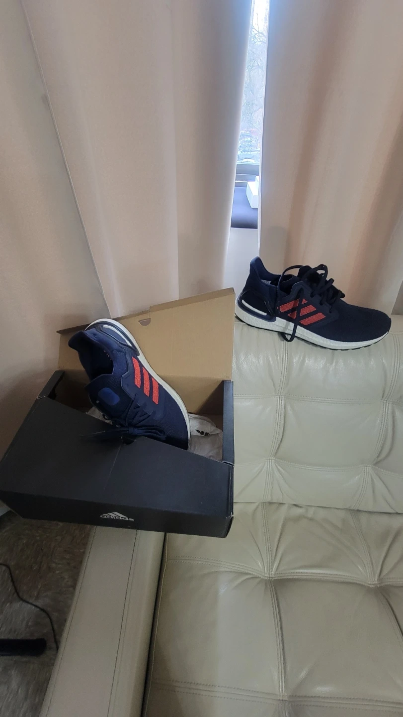 Adidas Ultraboost 20 running shoes in navy blue with red accents. Men's size 11.5. Includes original box. These shoes are designed for comfort and performance during runs.