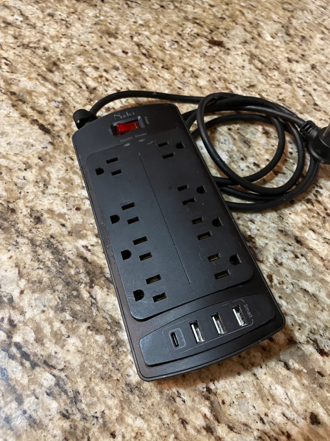 This Nuksa power strip has 8 AC outlets and 3 USB ports, including one USB-C. It features surge protection and a reset button. It's black and comes with a cord.