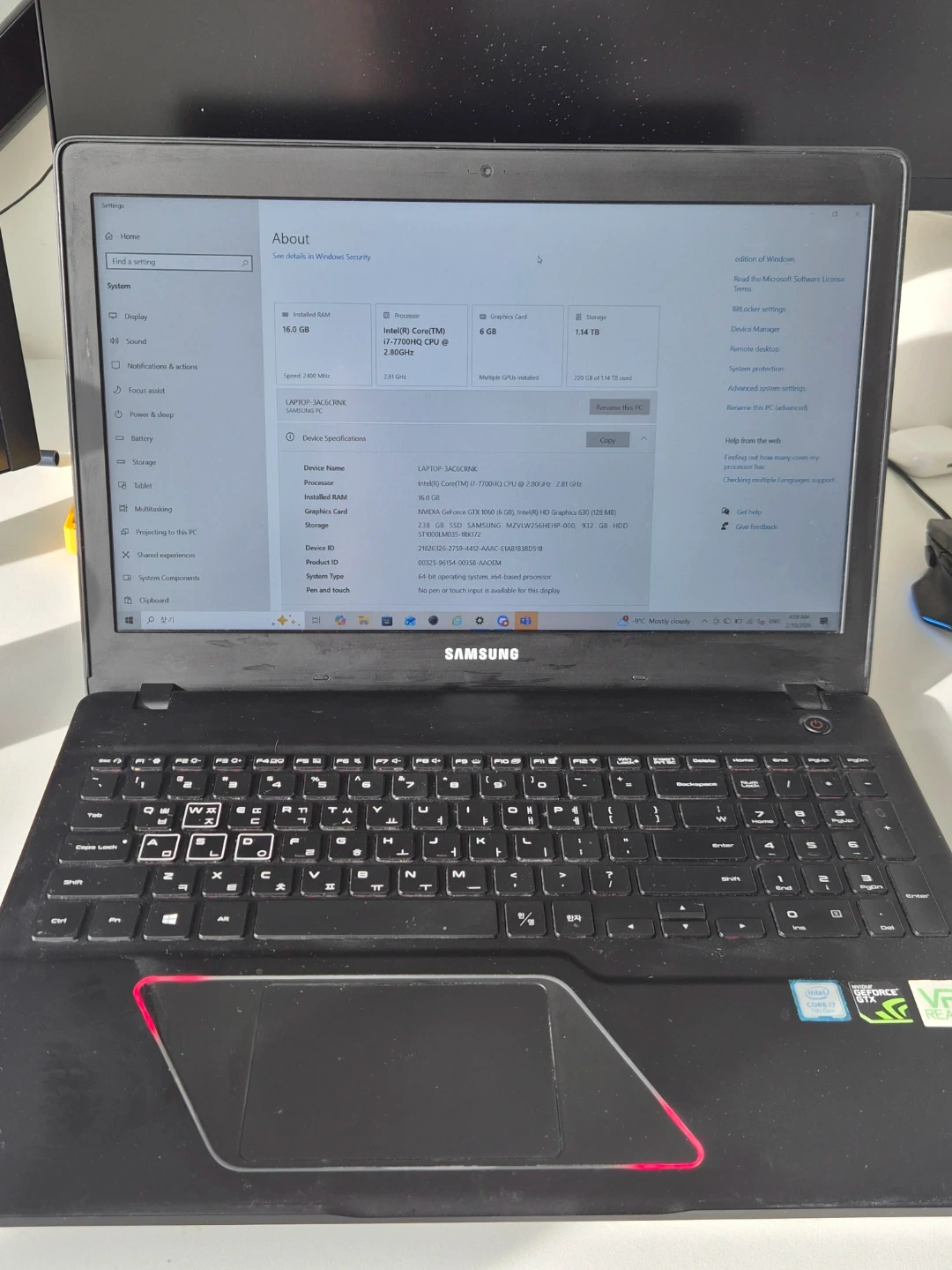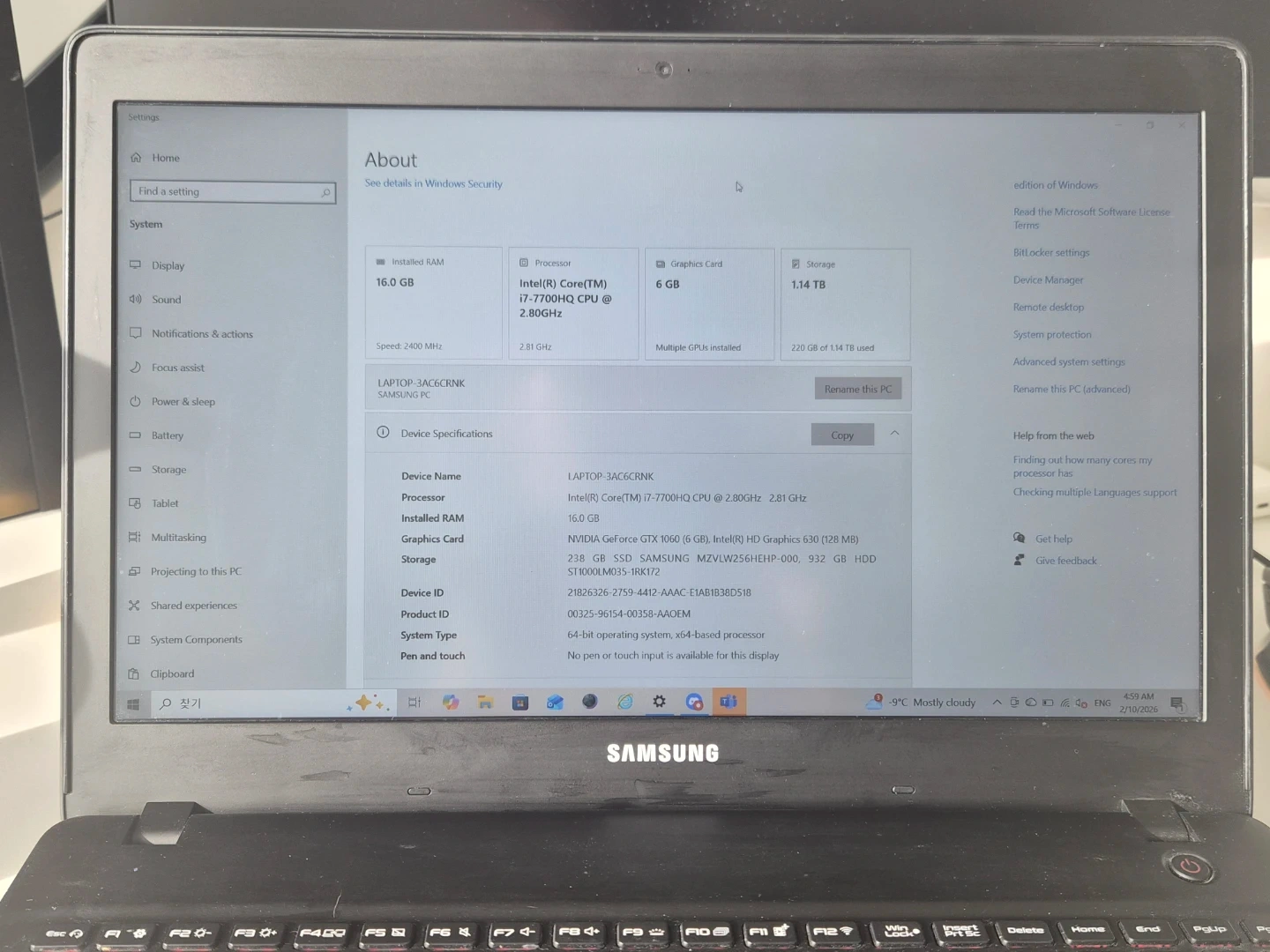 Samsung LAPTOP-3AC6CRNK Intel Core i7 16GB RAM