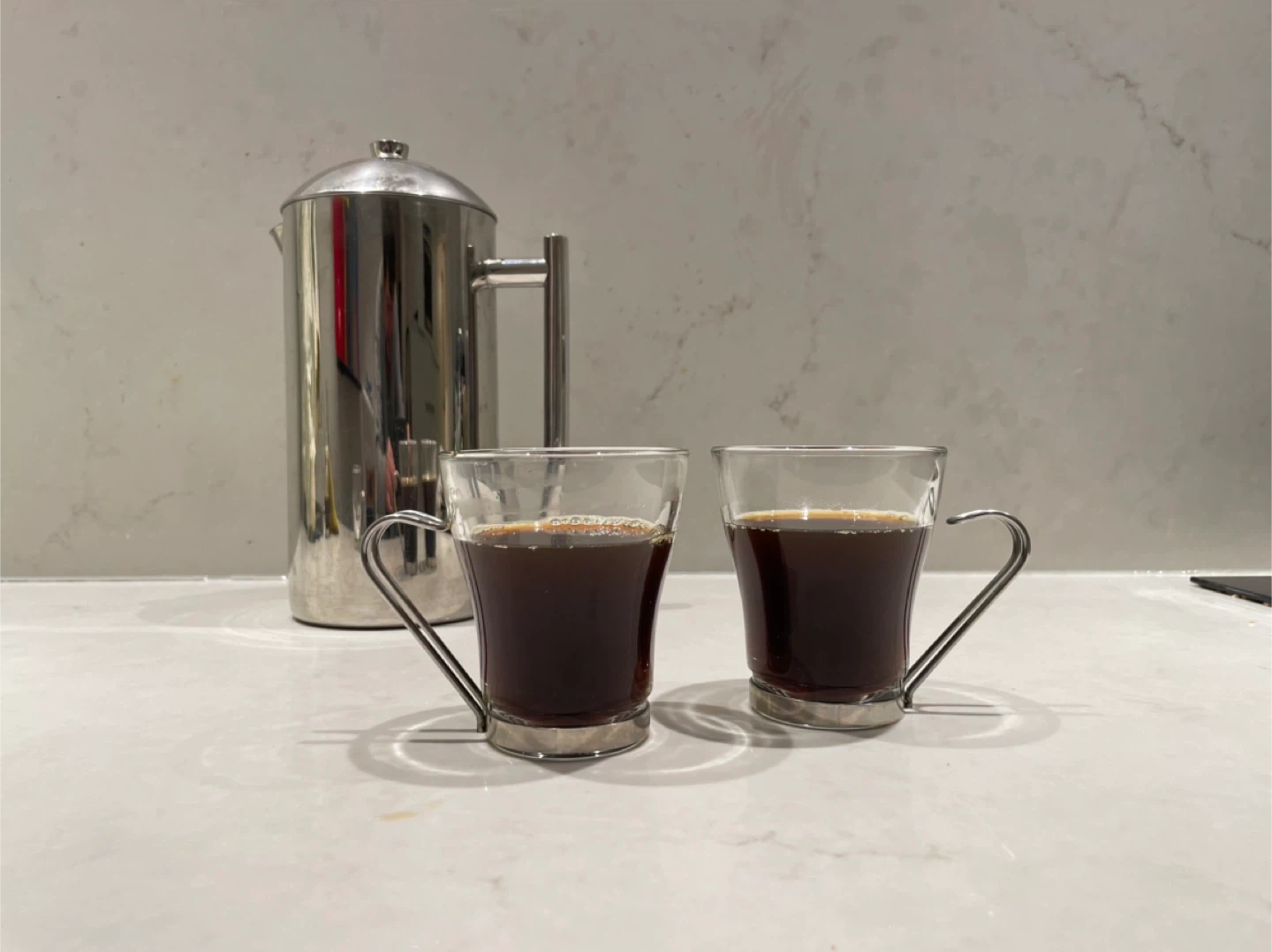 A set of four clear glass with a stainless steel handle Vitrosax Cappuccino Cups. Made In Italy. 8 oz. Dishwasher friendly. 8 cups available.