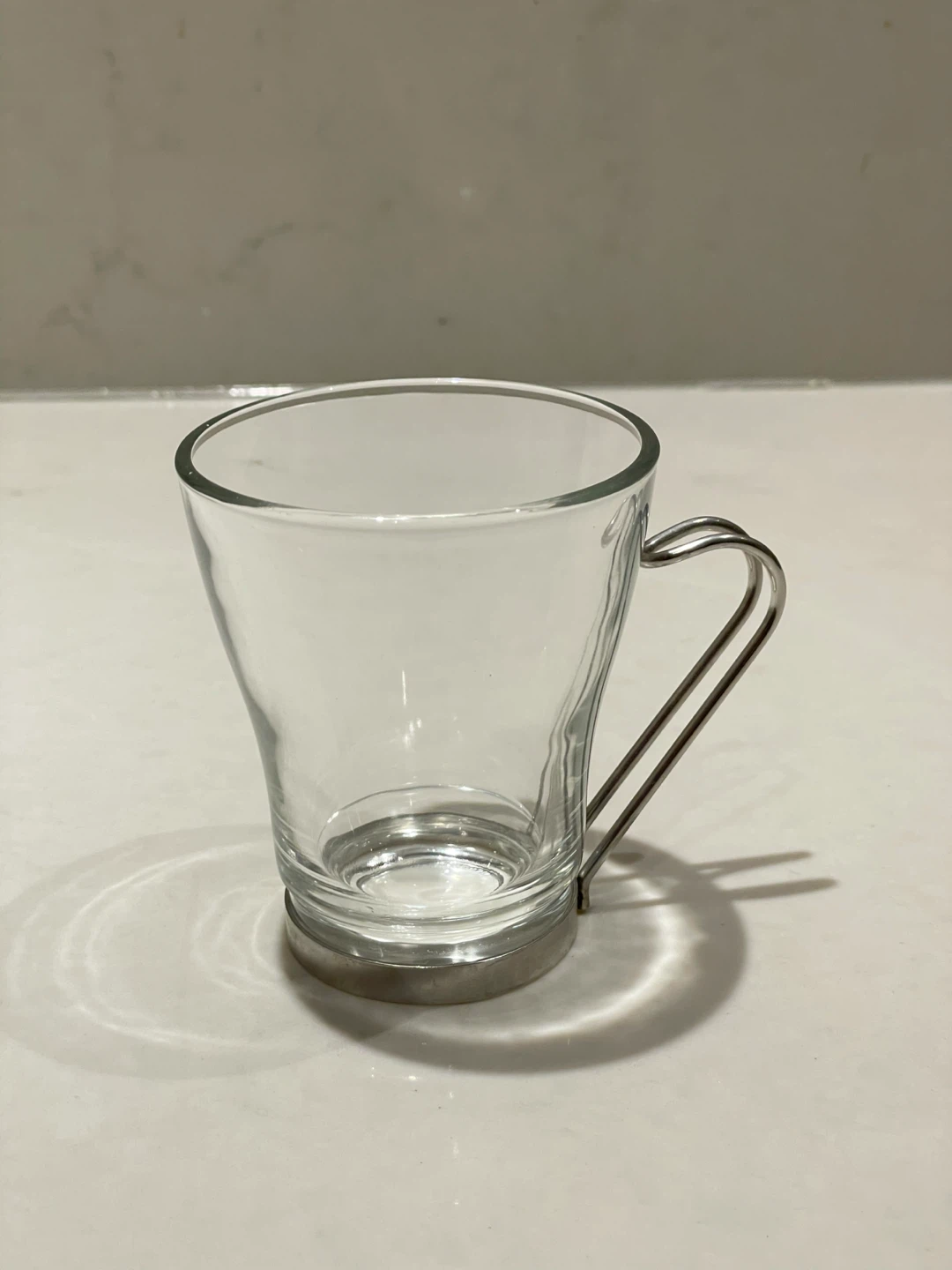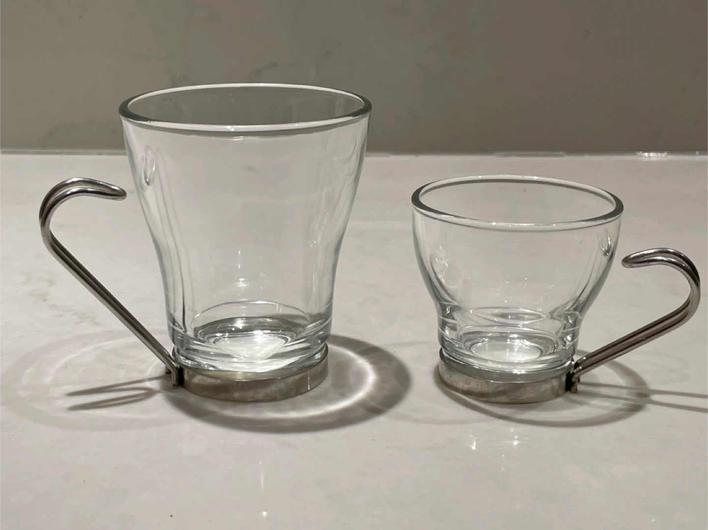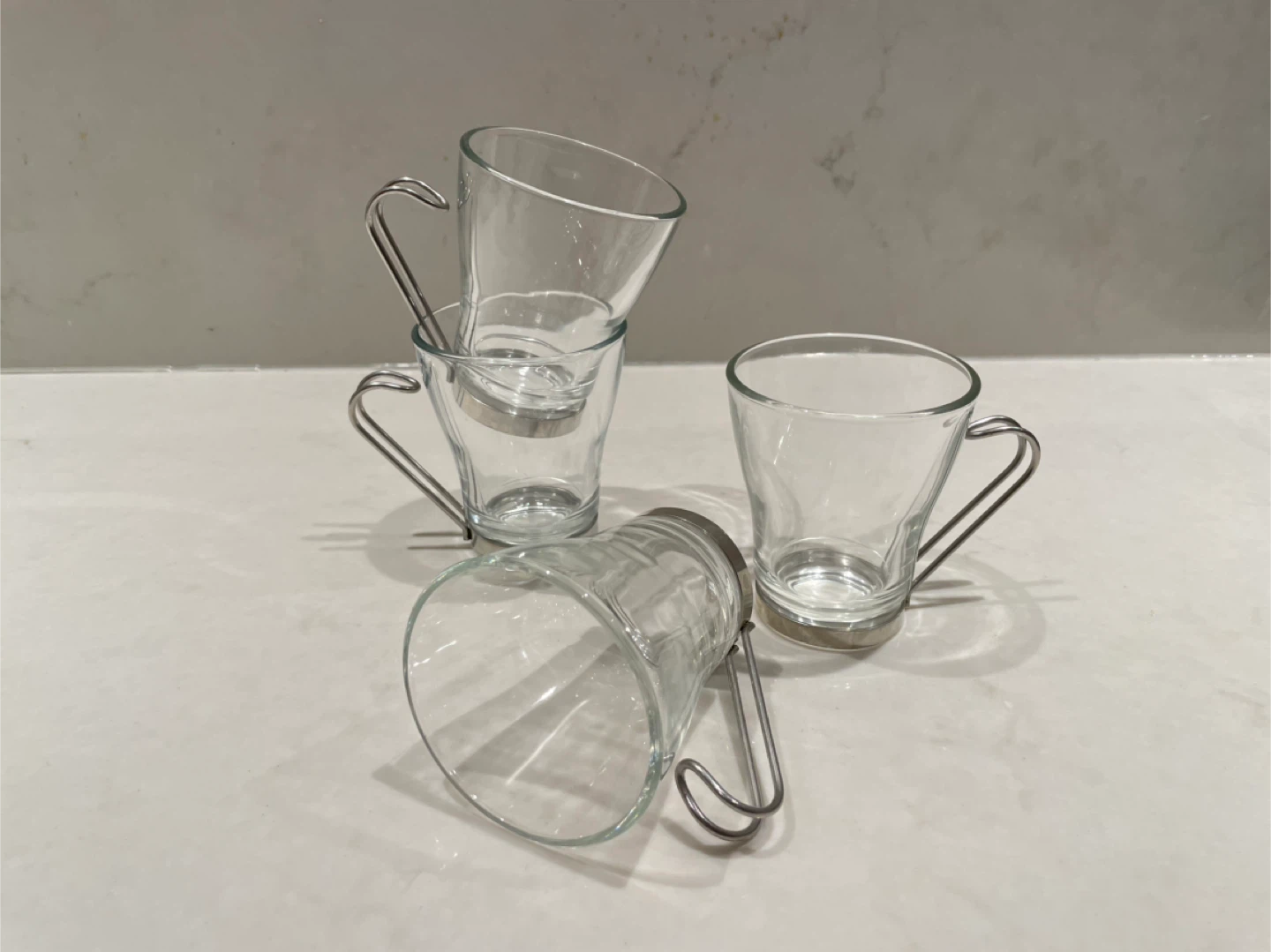 A set of four clear glass with a stainless steel handle Vitrosax Cappuccino Cups. Made In Italy. 8 oz. Dishwasher friendly. 8 cups available.