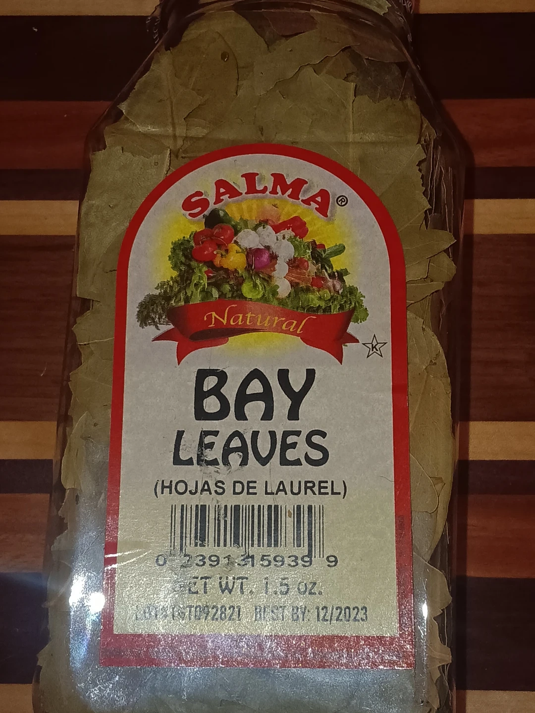 Salma Natural Bay Leaves in a 1.5 oz container. Best by 12/2023. These bay leaves are perfect for adding flavor to soups, stews, and other savory dishes.