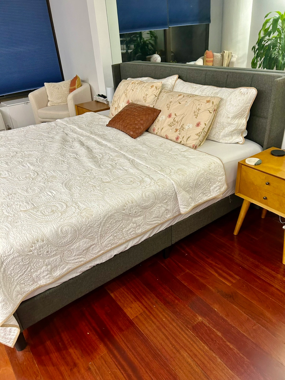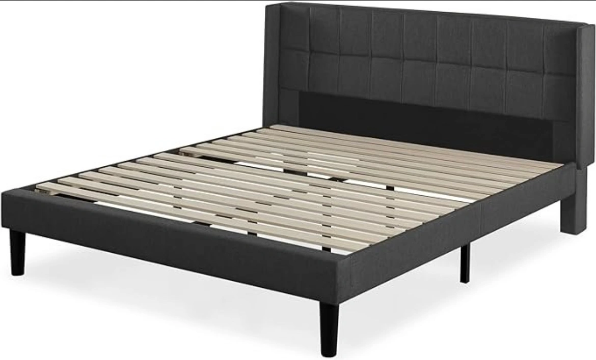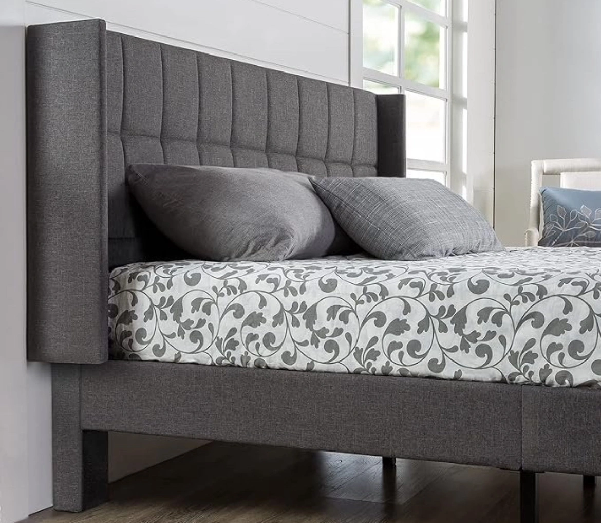 Gray upholstered bed frame with a tufted headboard. Includes slats for mattress support but does not include a mattress or box spring.