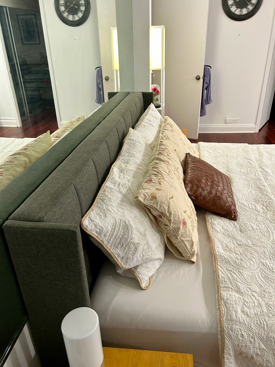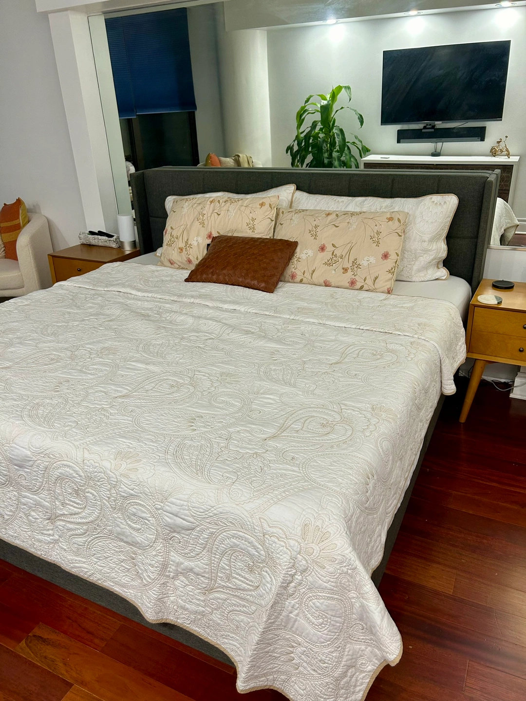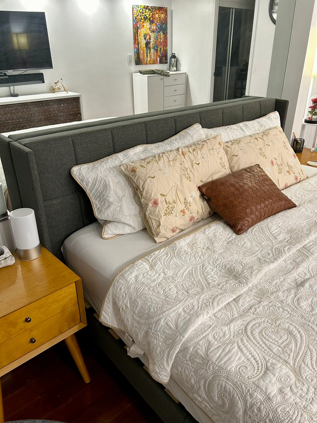 Gray upholstered bed frame with a tufted headboard. Includes slats for mattress support but does not include a mattress or box spring.