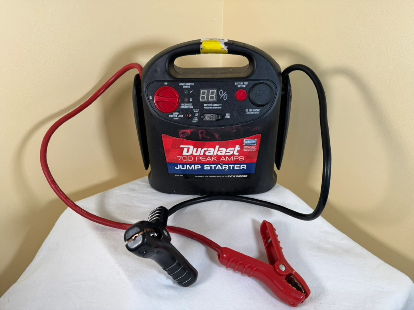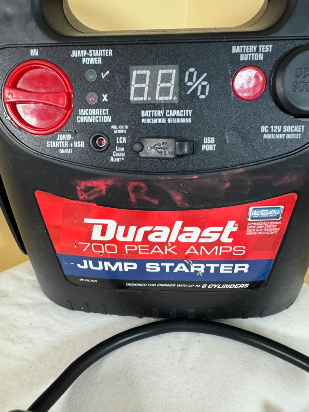 This Duralast jump starter offers 700 peak amps for vehicles designed for engines up to 6 cylinders. It includes a battery capacity indicator showing percentage remaining. Features a DC 12V socket for auxiliary power.