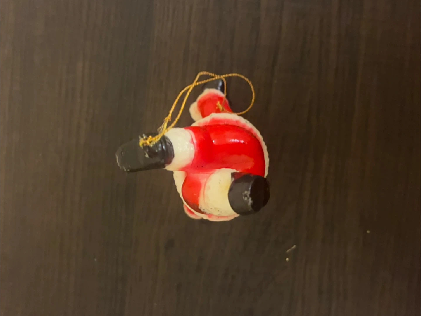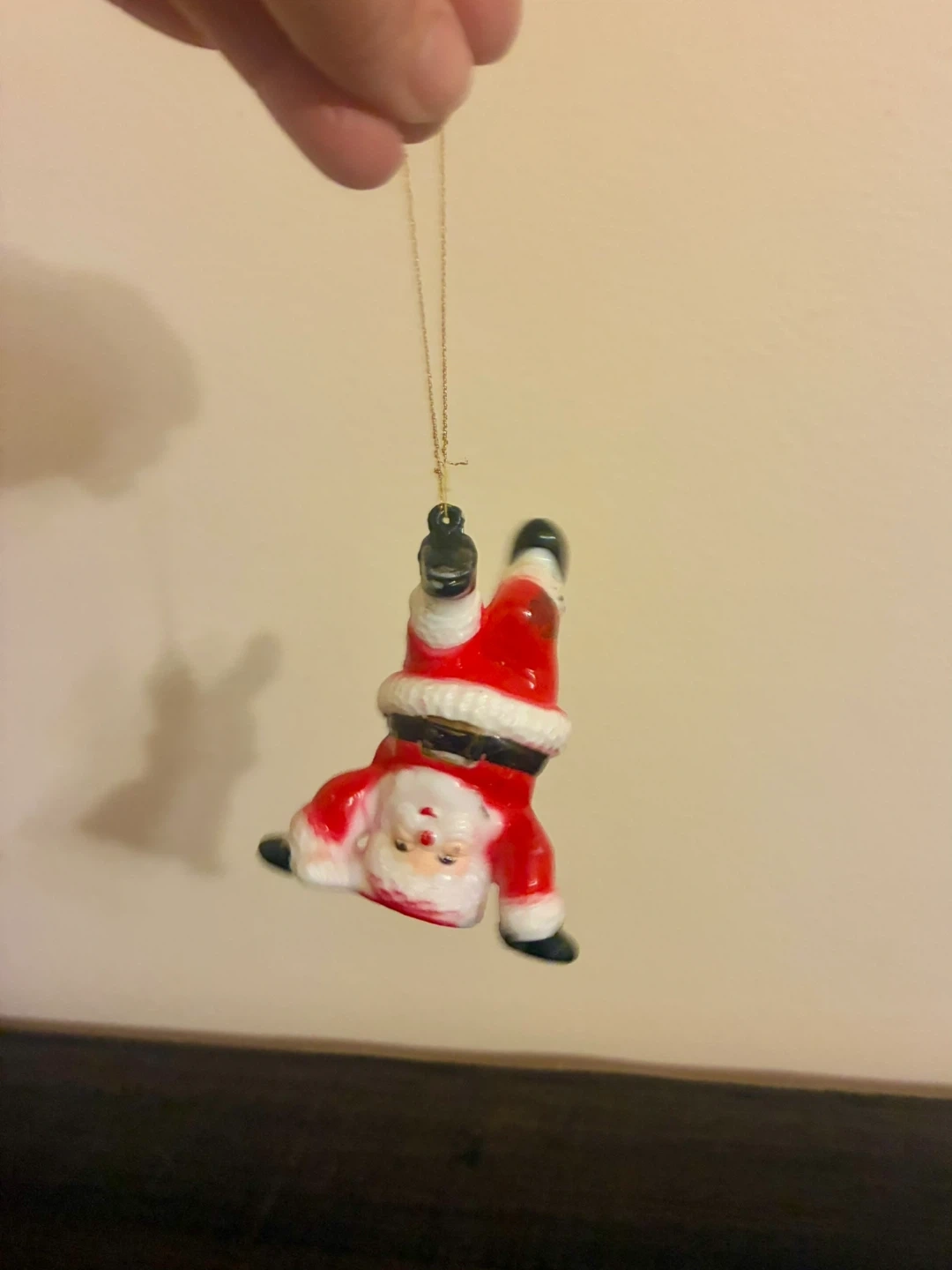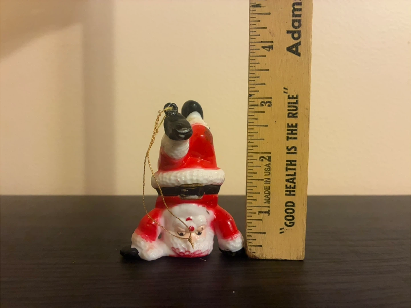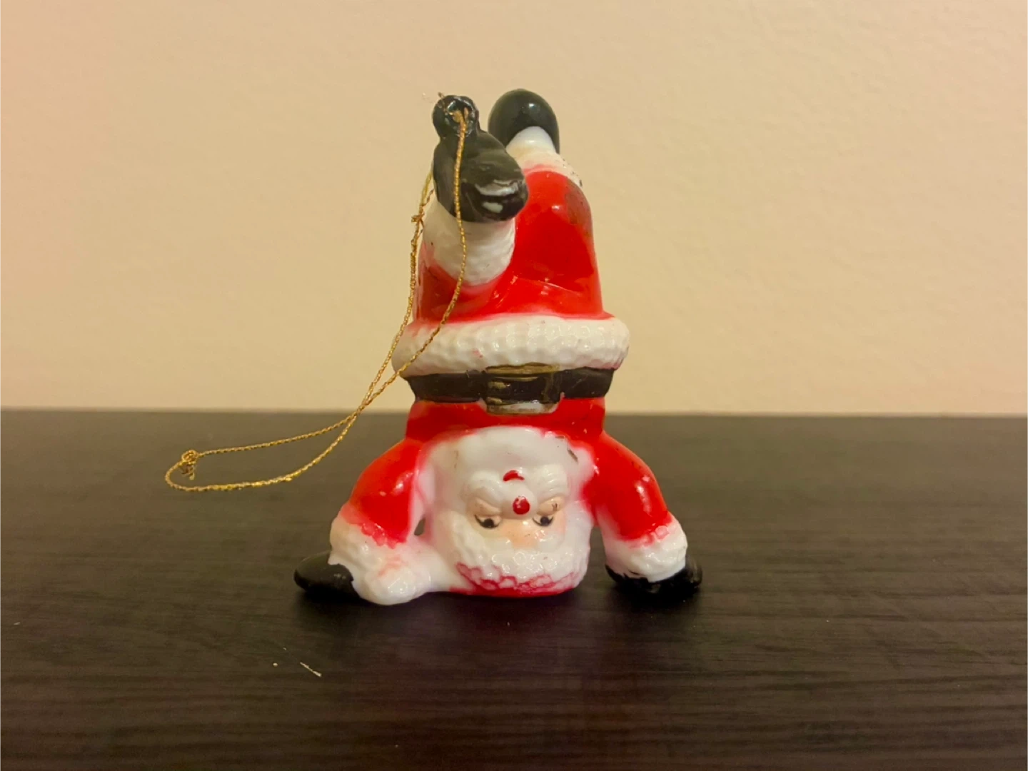 This is a fun upside down Santa Christmas ornament! It is red, white, and black with a gold string for hanging on your tree. It's in good condition and ready to add some quirky charm to your holiday decorations