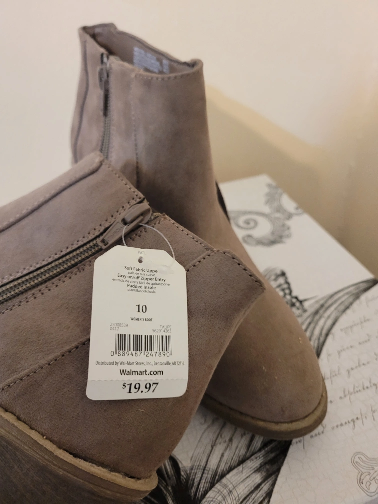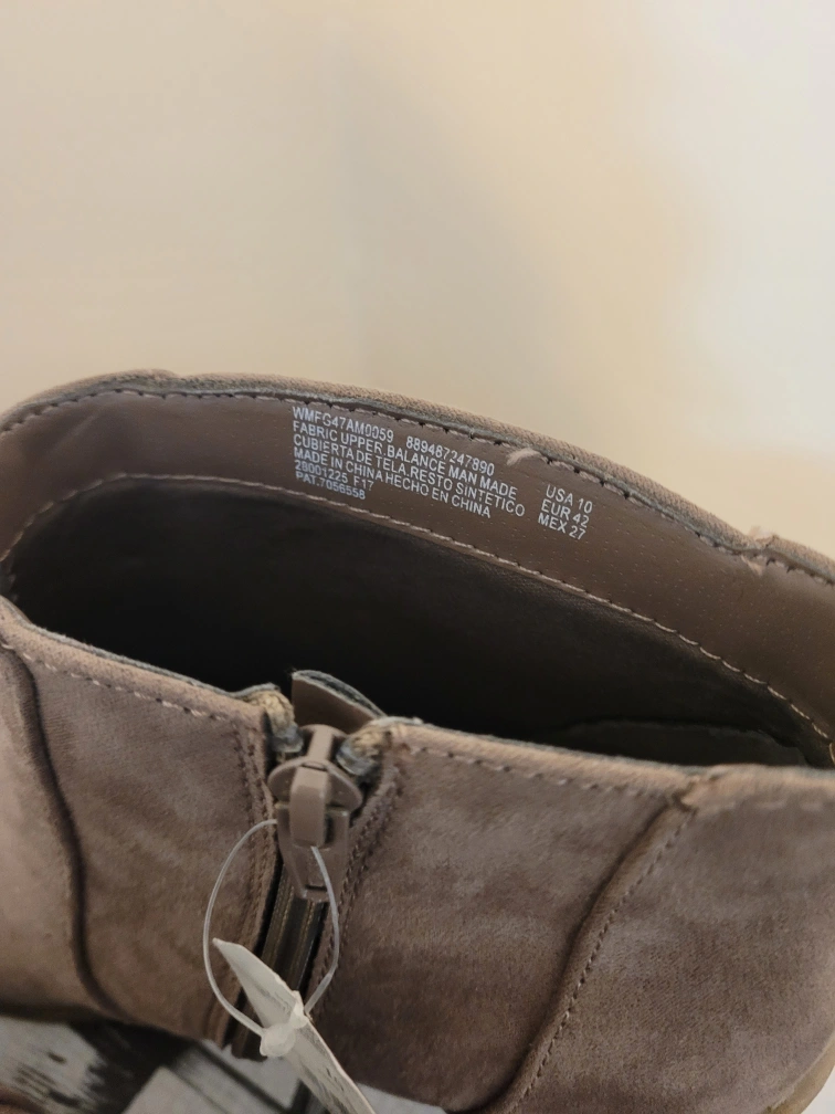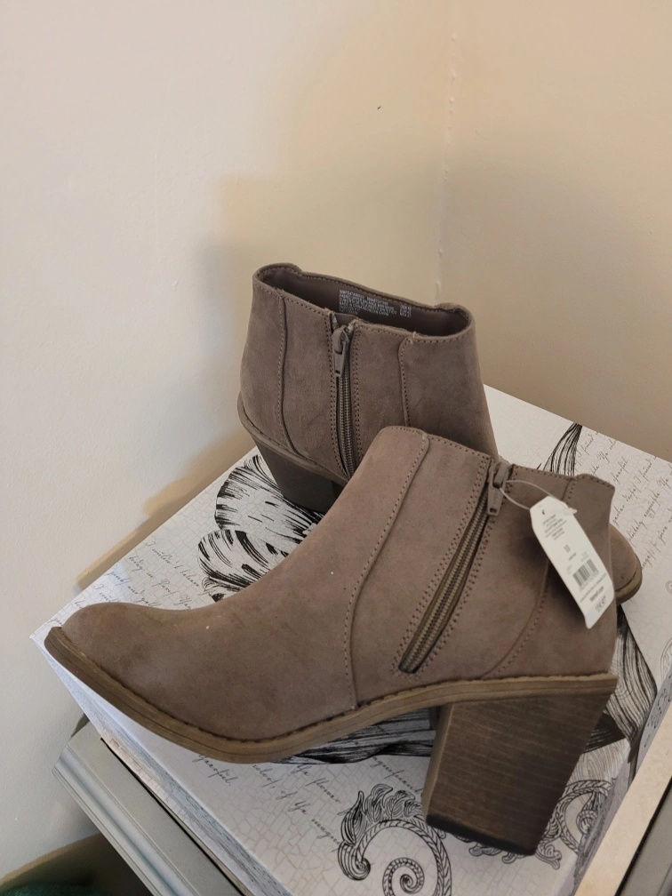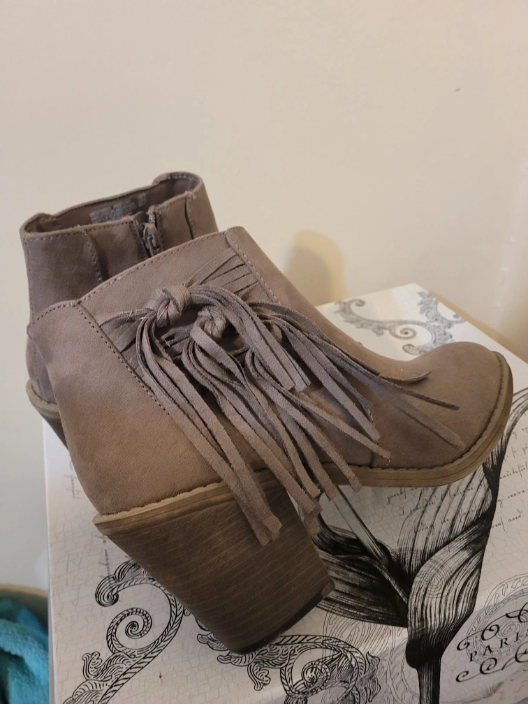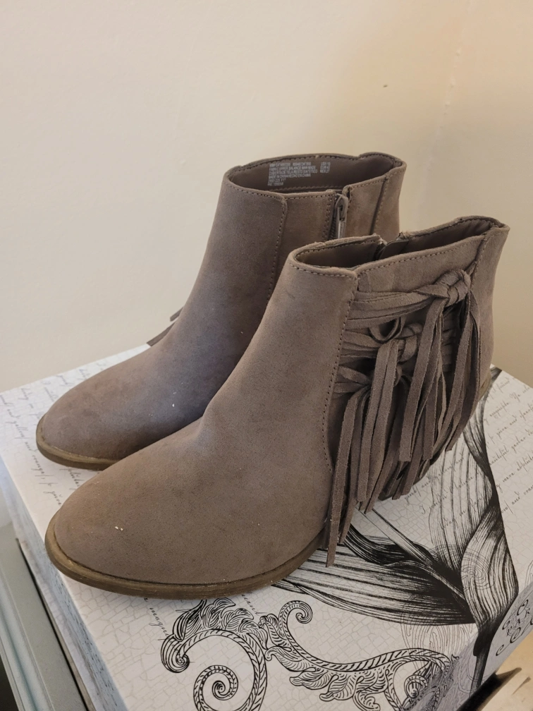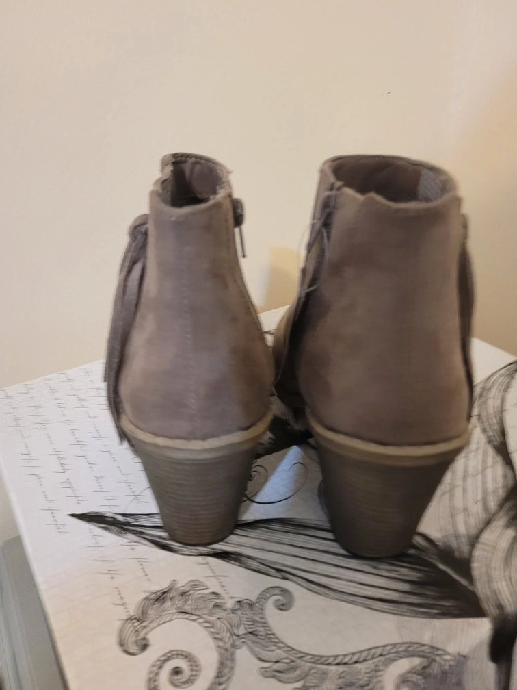 NEW women's booties in size 10. They are taupe-colored with a soft fabric upper and easy on/off zipper entry. The tassels can be removed. They were originally bought for a concert but was never worn.