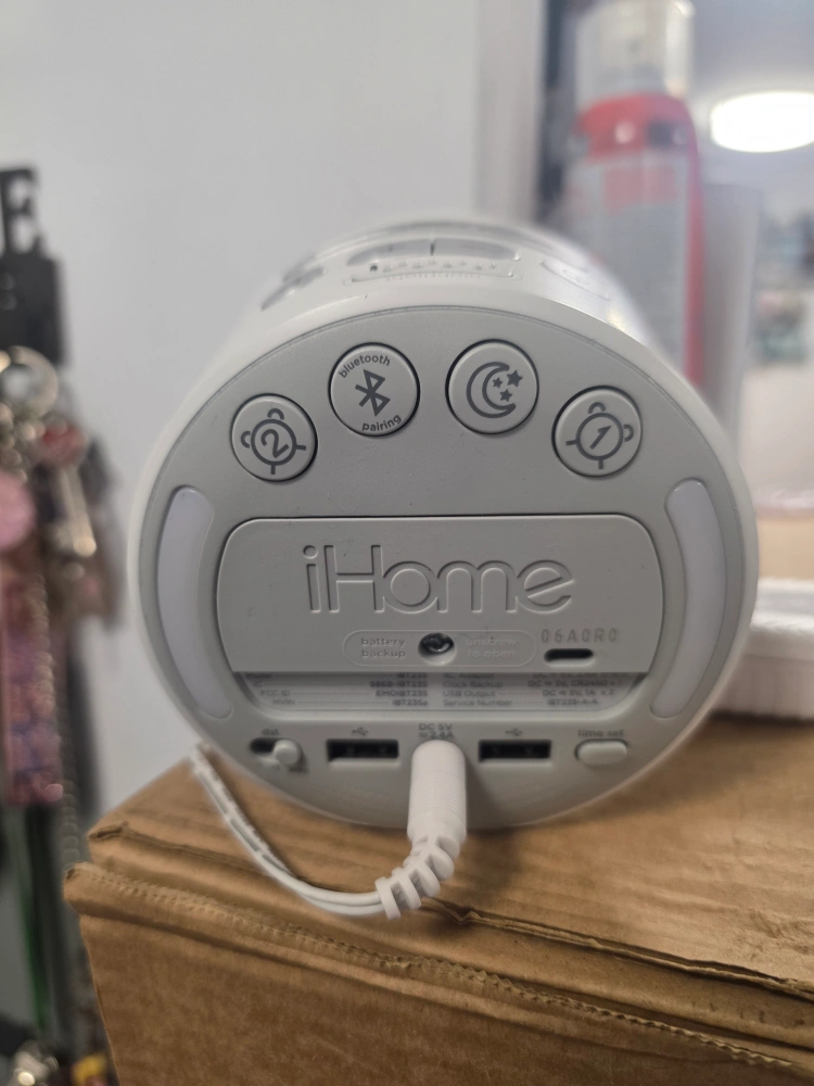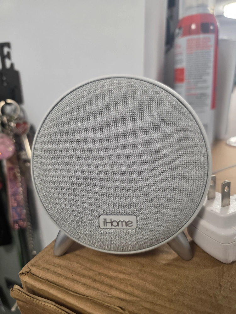 A round-shaped speaker. Features a fabric front. Has three small legs. The back has buttons and ports. This speaker would be great to listen to some calming music before bed.
