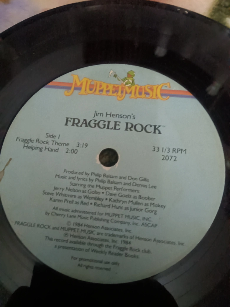 Selling a Fraggle Rock vinyl record featuring Jim Henson's Muppet Music! This record includes: - Fraggle Rock Theme (3:19) - Helping Hand (2:00) It plays at 33 1/3 RPM and is from 1984