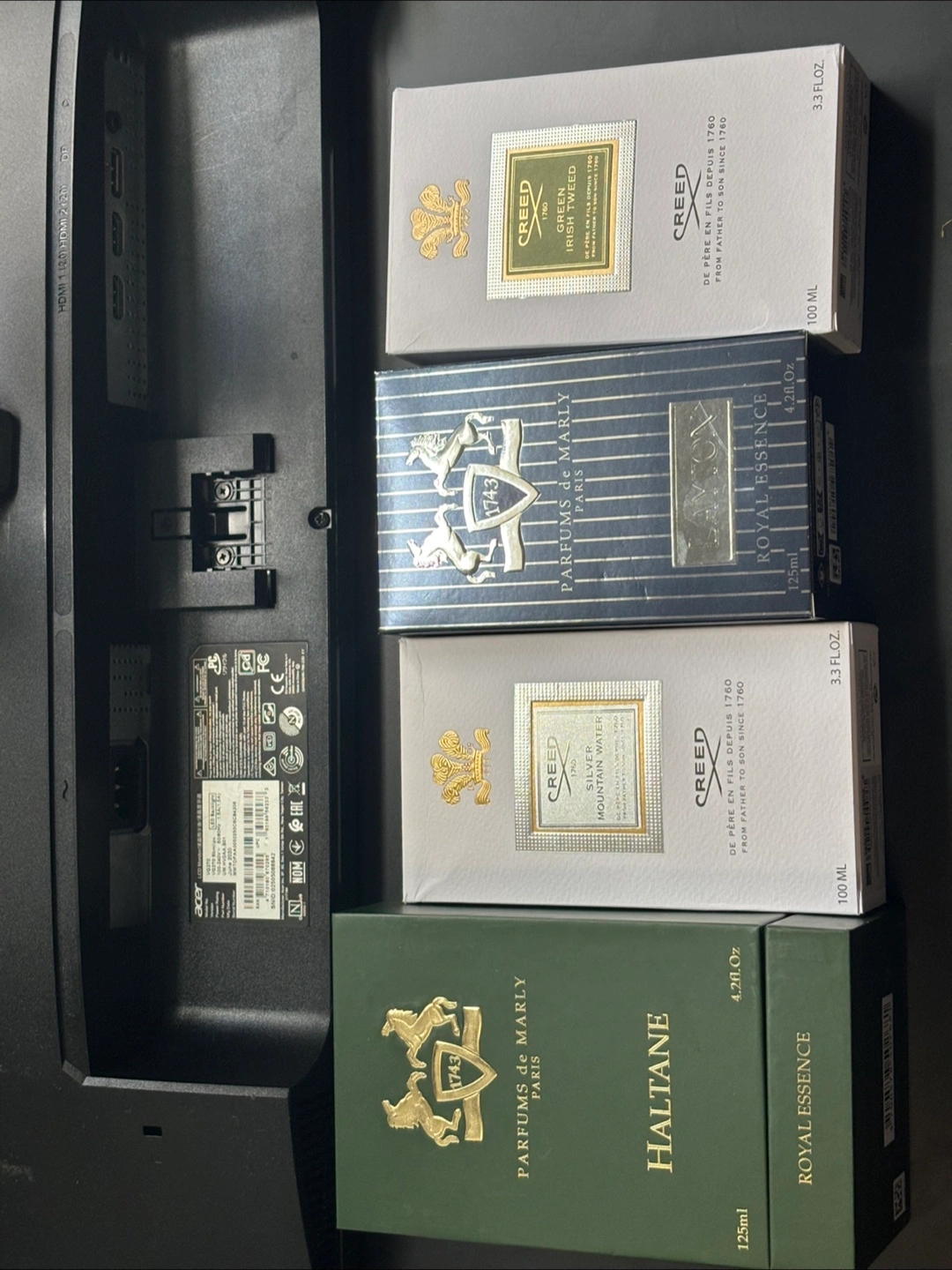 Selling Creed Green Irish Tweed, Creed Silver Mountain Water, Parfums de Marly Haltane, and Parfums de Marly Royal Essence! All are in their original boxes. The Creed bottles are 100ml / 3.3 fl.oz, while the Parfums de Marly Haltane is 125ml / 4.2 fl.oz 100 each or dm offers