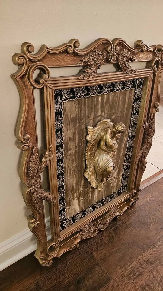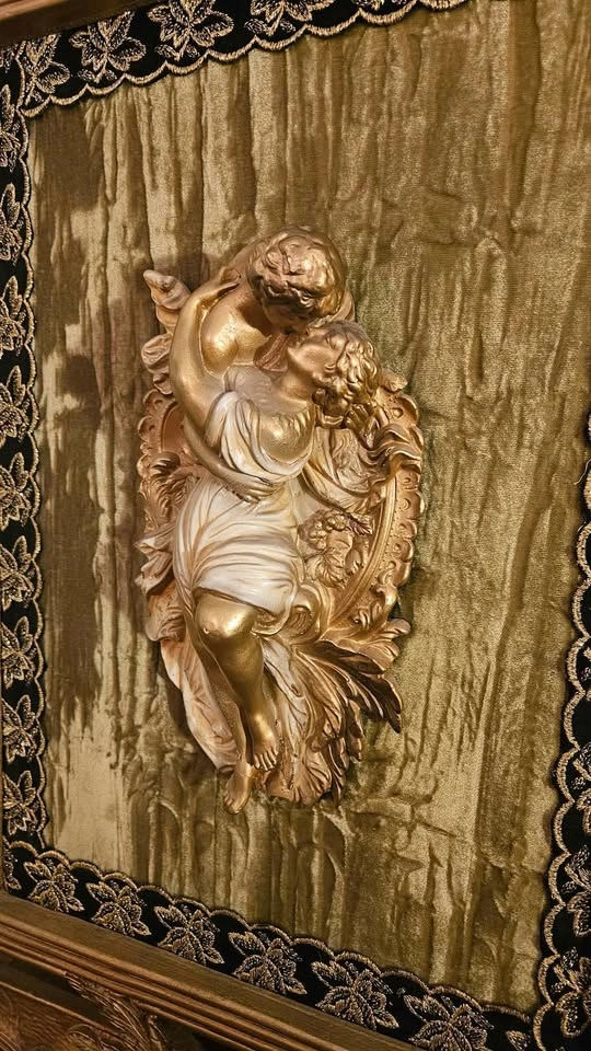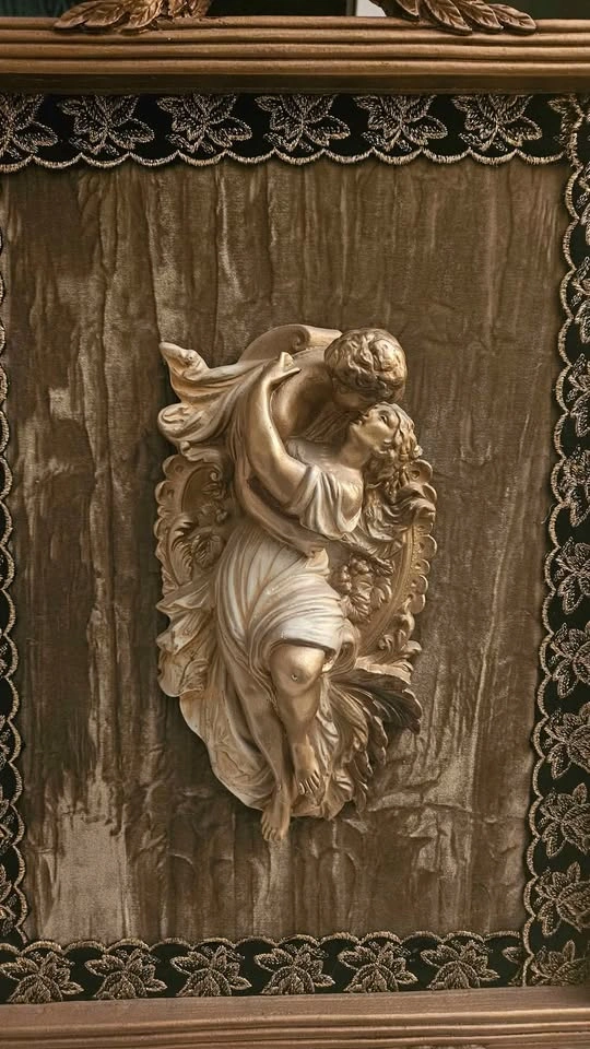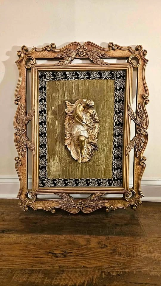 10The relief is mounted on a textured, moss-green crushed velvet fabric with Lace/Trim. French giltwood frame carved with floral and foliate motifs. Dimensions 24inX30in Please note This exquisite sculpture captures elegance and movement in every detail. While there is a subtle imperfection on the legs, it does not detract from the overall beauty and character of the piece. Thank you