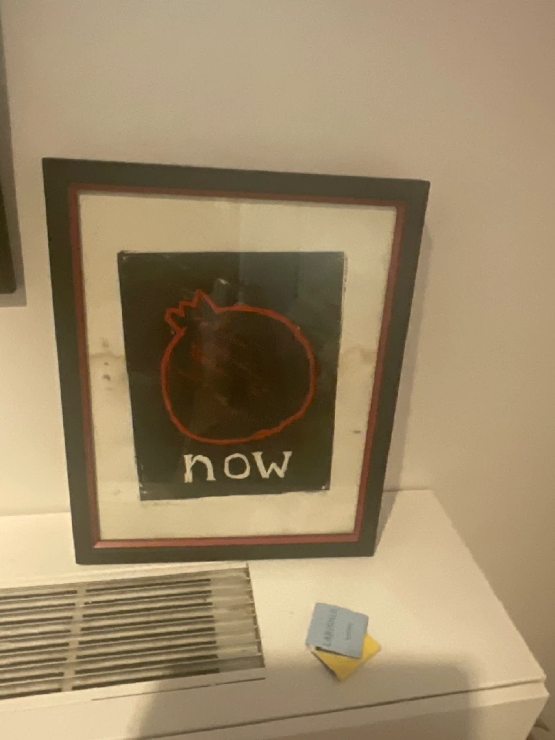 Unique framed art piece featuring a pomegranate design with the word 'now'. Great for adding a pop of color and a modern touch to any room!