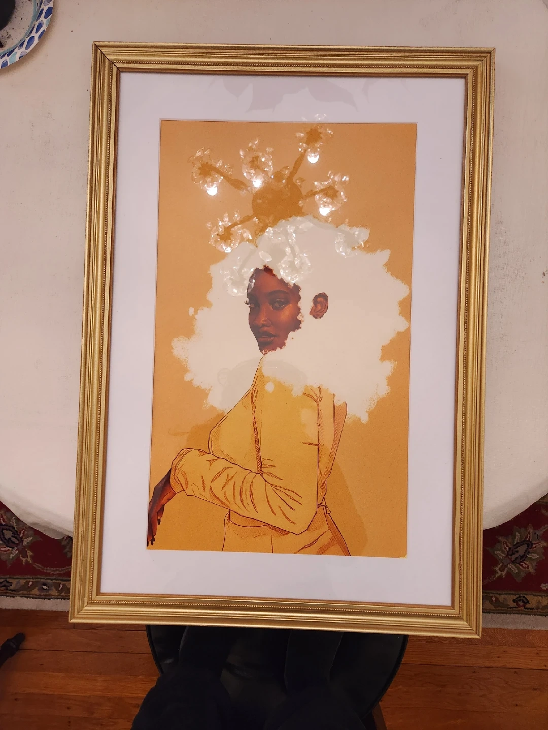 87Selling a framed art print. It's in great condition and ready to hang! The frame is a gold color.