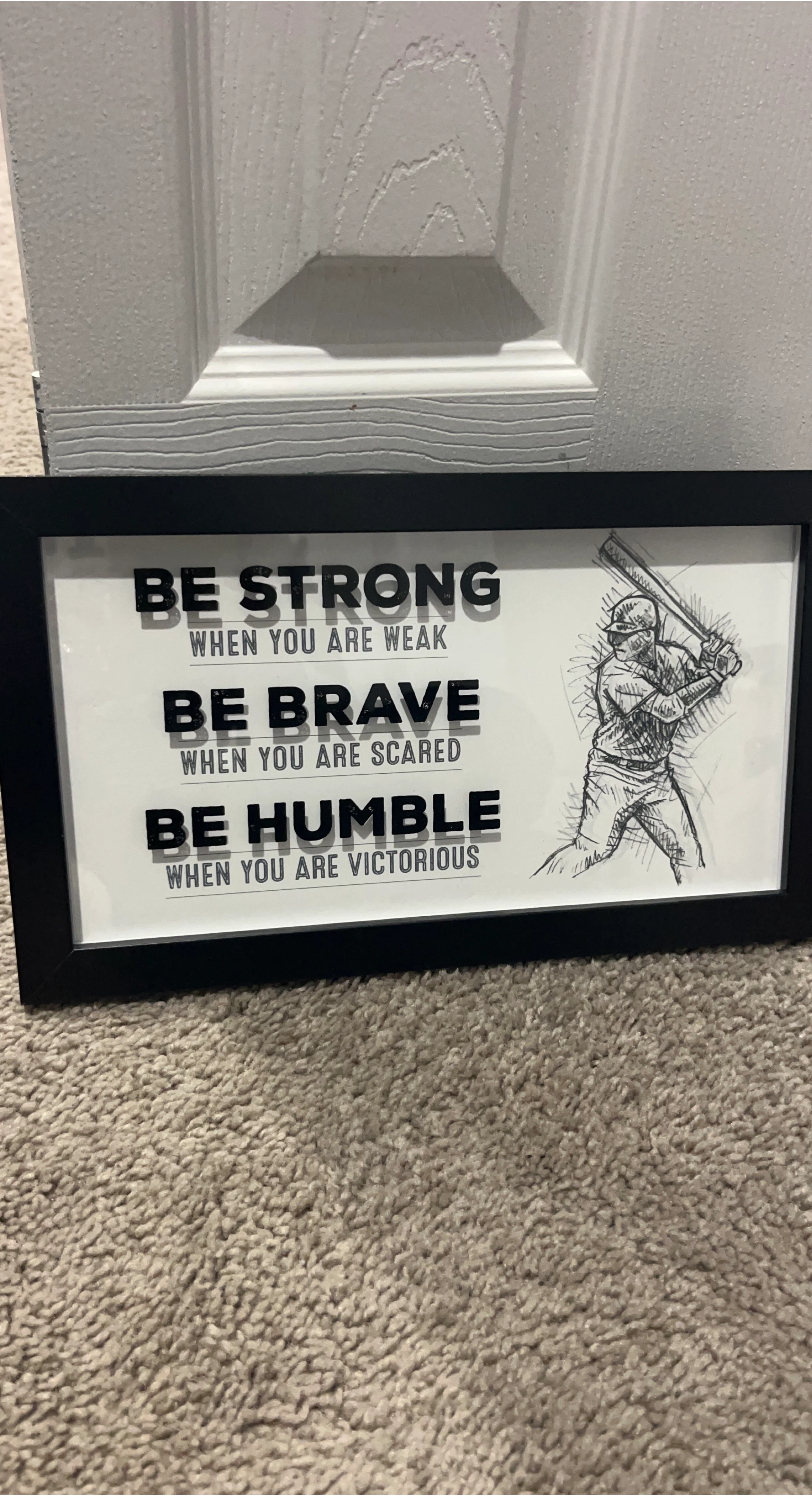 5Framed art featuring a baseball player and the words: Be Strong when you are weak, Be Brave when you are scared, Be Humble when you are victorious