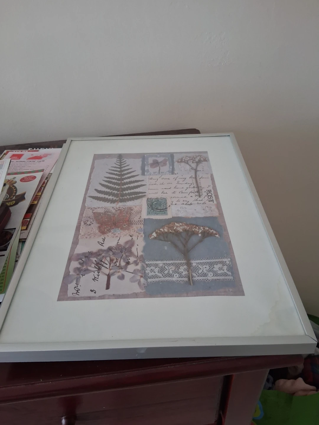 70This is a framed botanical print, perfect for adding a touch of nature to your home decor. The print features various botanical elements like ferns and other plants, set against a collage-style background. The frame is a simple, light color that complements the artwork. It's in good condition and ready to hang!