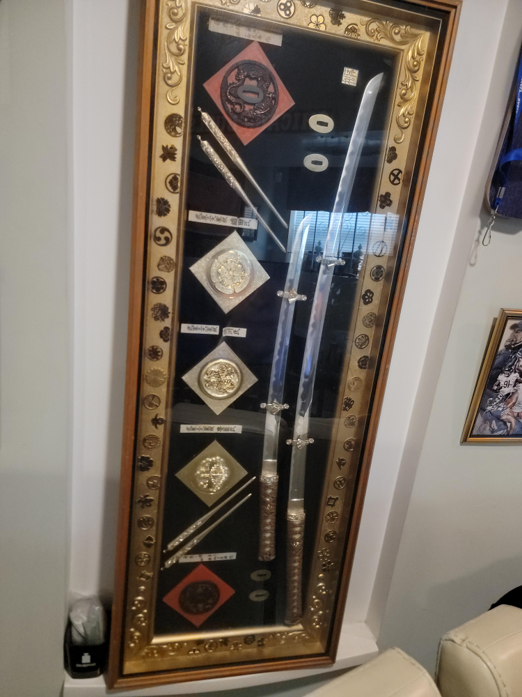 Selling a framed decorative katana set. The set includes two katanas, chopsticks, and decorative emblems, all encased in a beautifully ornate frame. It's a unique piece of wall art!