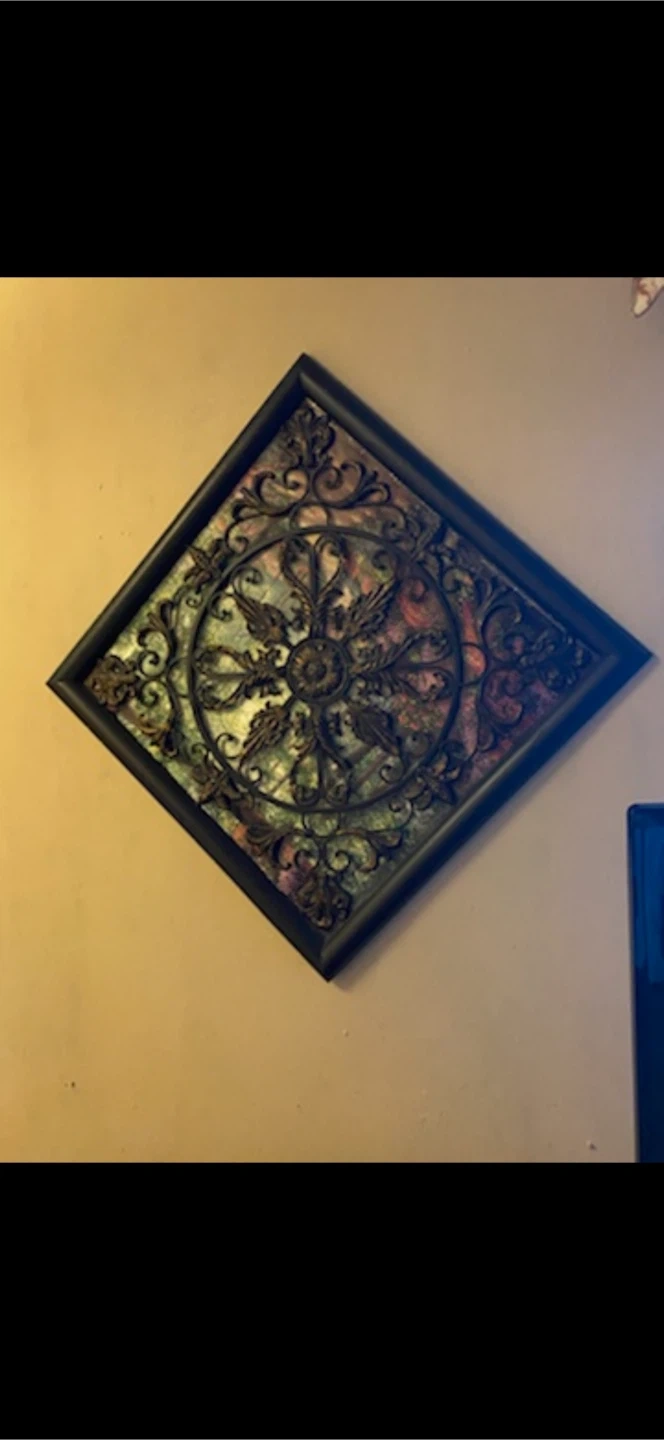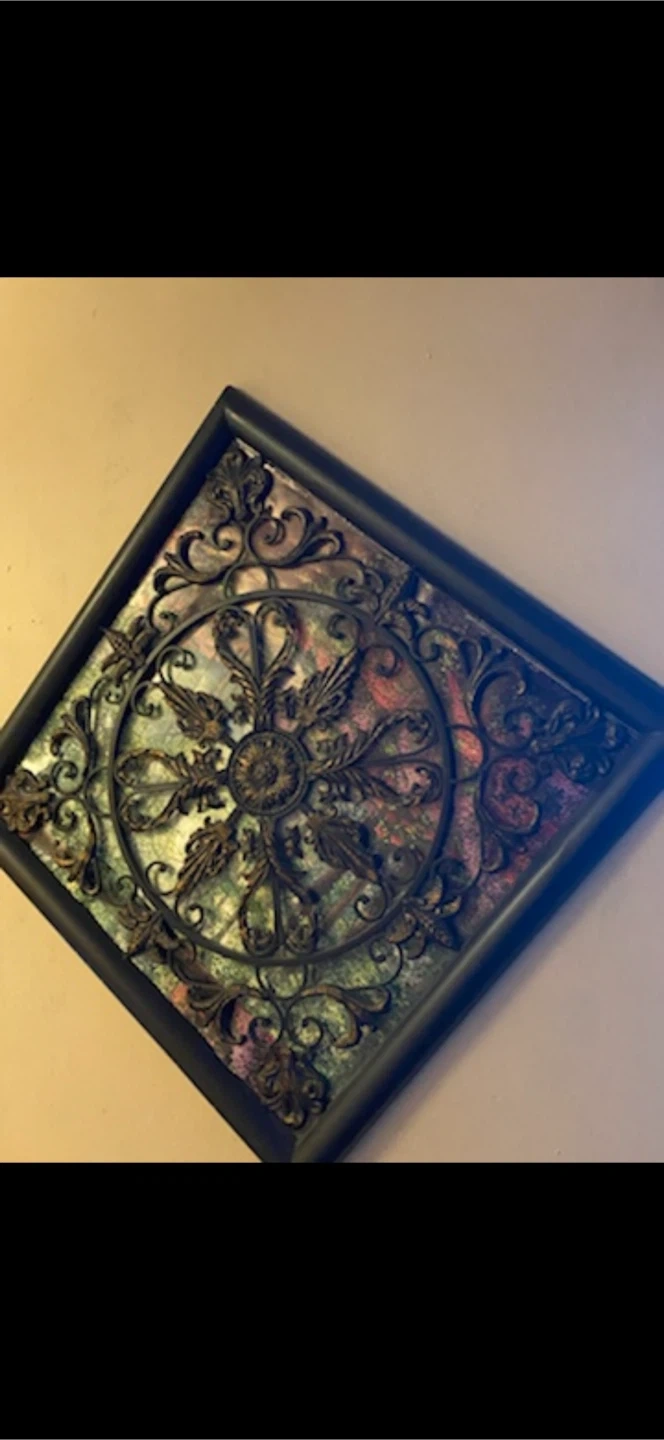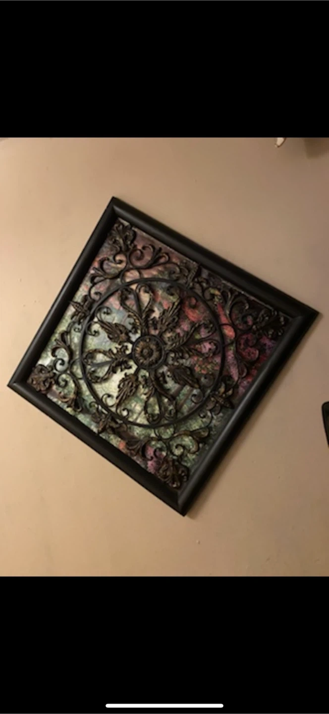 10Selling a decorative wall art piece with a black frame. It has a unique design with swirling patterns and a central medallion. It would look great in any room!