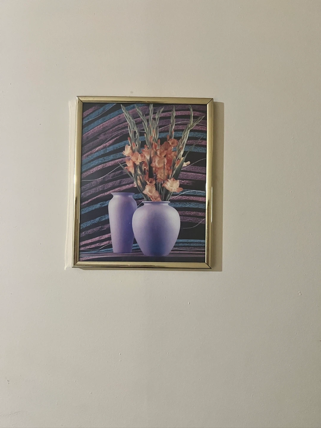 110A framed floral print featuring two vases and flowers. The frame is gold colored, and the background has purple and blue stripes