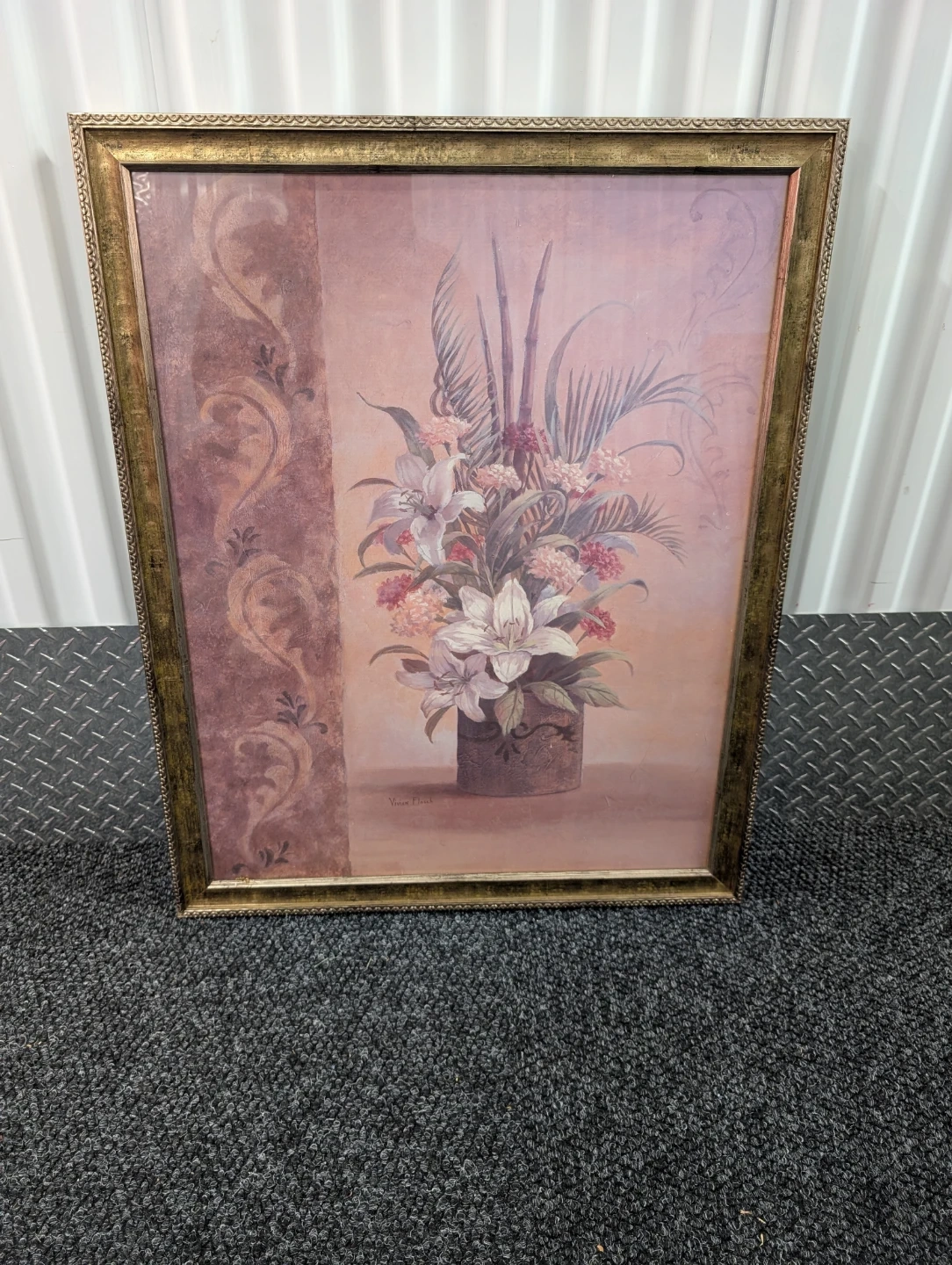 189A framed floral print featuring lilies and other flowers in a vase. The frame is a decorative gold color. It would make a nice addition to any room 30x25