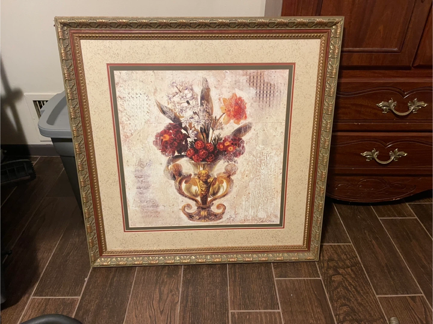 Selling a framed floral print. The frame has a gold color. It would look great in any room