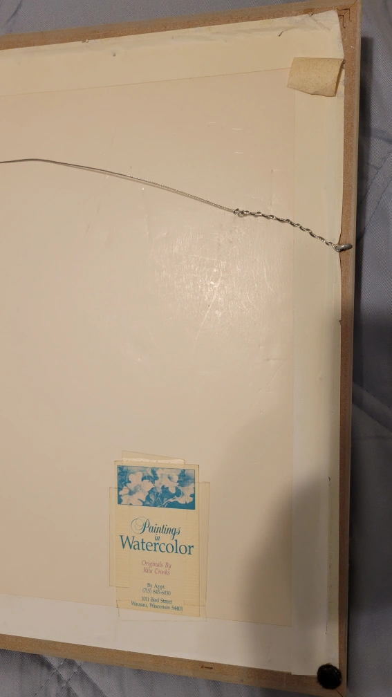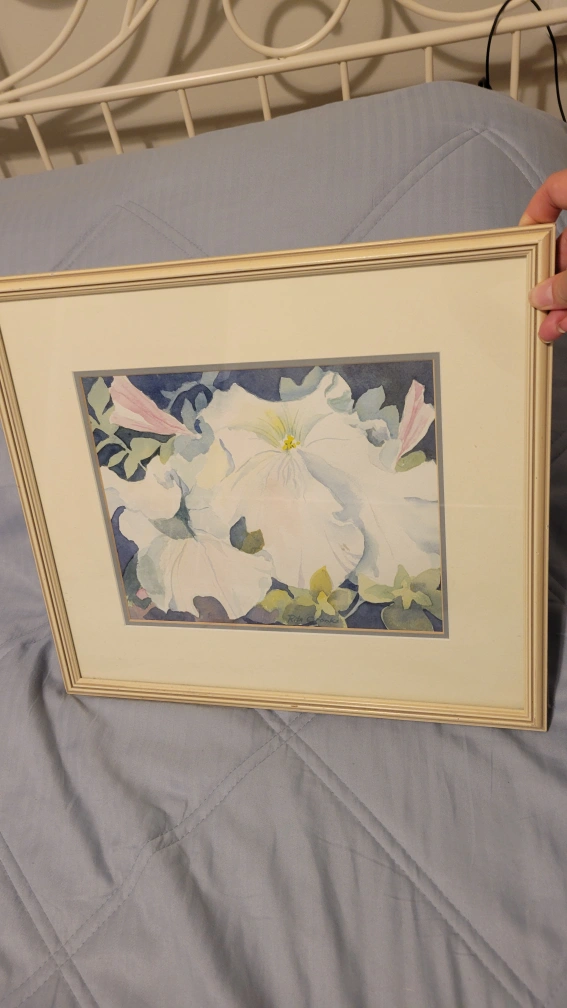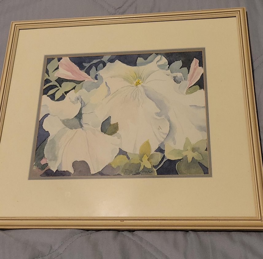 Selling a framed watercolor painting by Rita Crooks. It features a beautiful floral design with a white flower as the focal point. The painting is in a light-colored frame and would be a lovely addition to any room 16x14