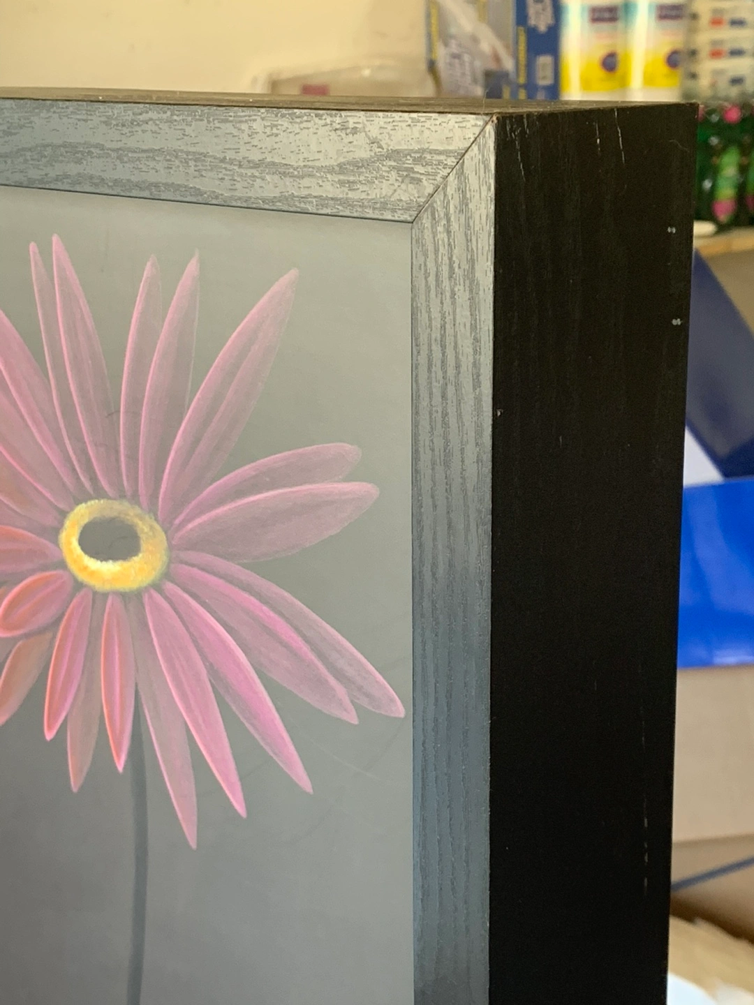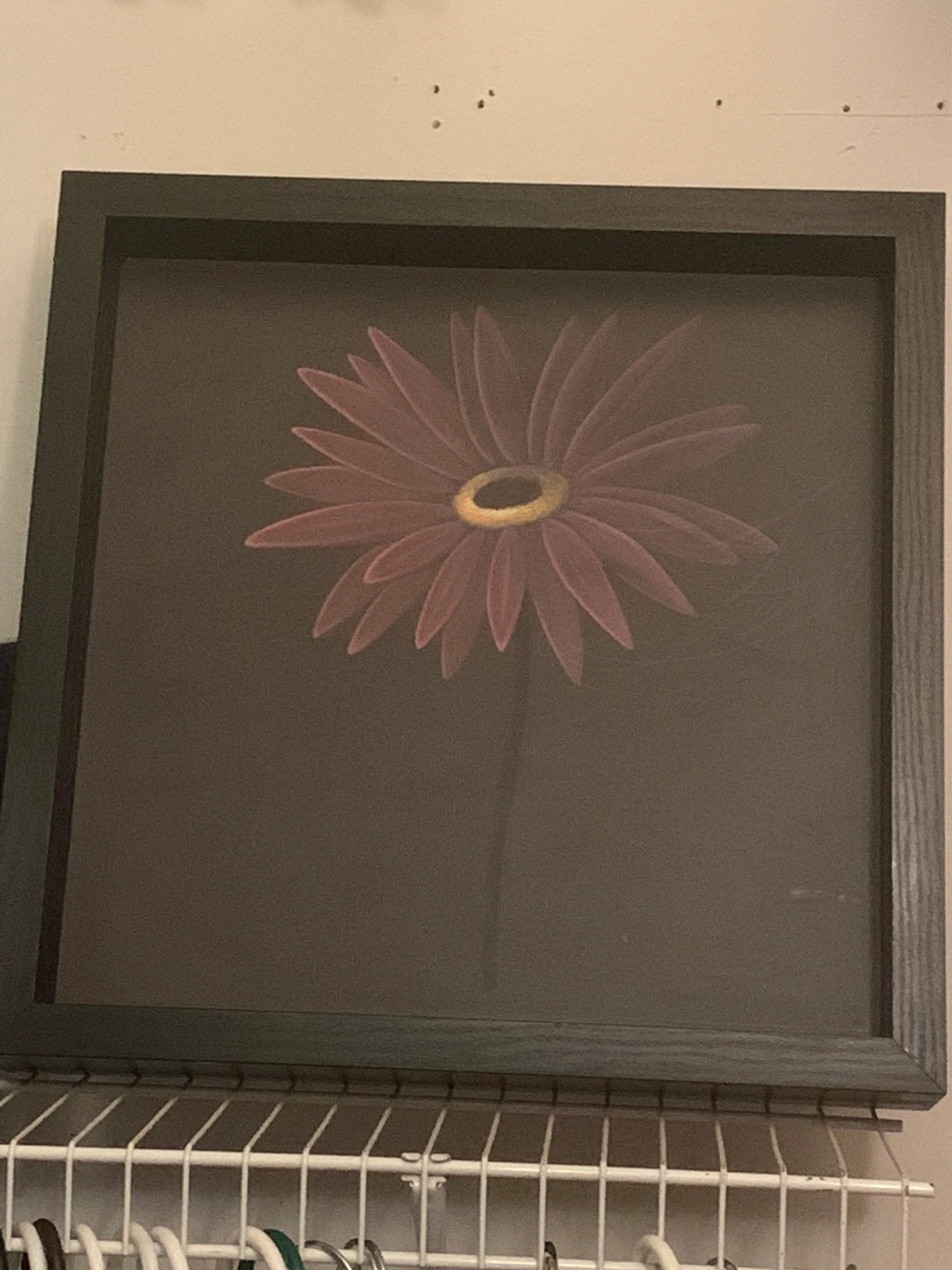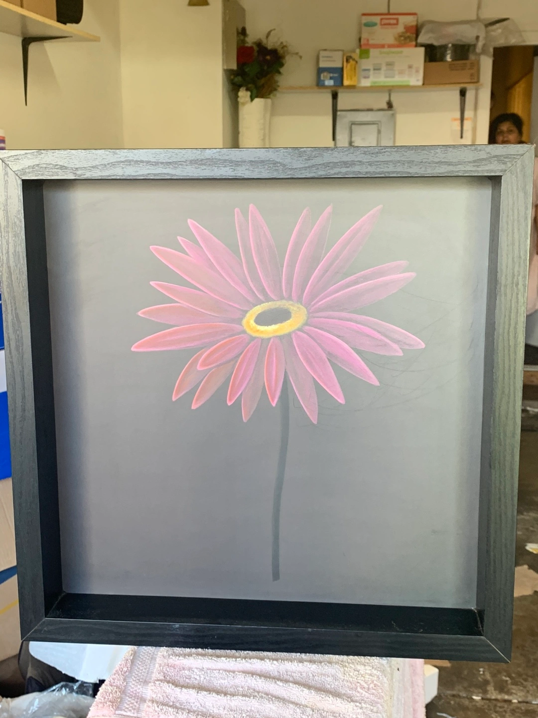 Square framed art print. Features a single gerbera daisy. Dark gray background. Black frame. Ready to hang. Available for local pickup by Schaumburg and Barrington Road in Schaumburg IL 60194 or shipping to your doorstep for one low price with tracking included for free. Comes from a virus free, smoke free and pet free home.